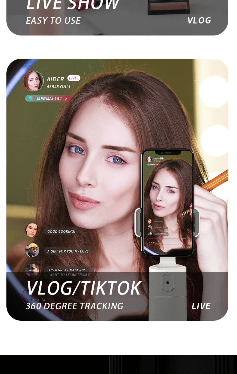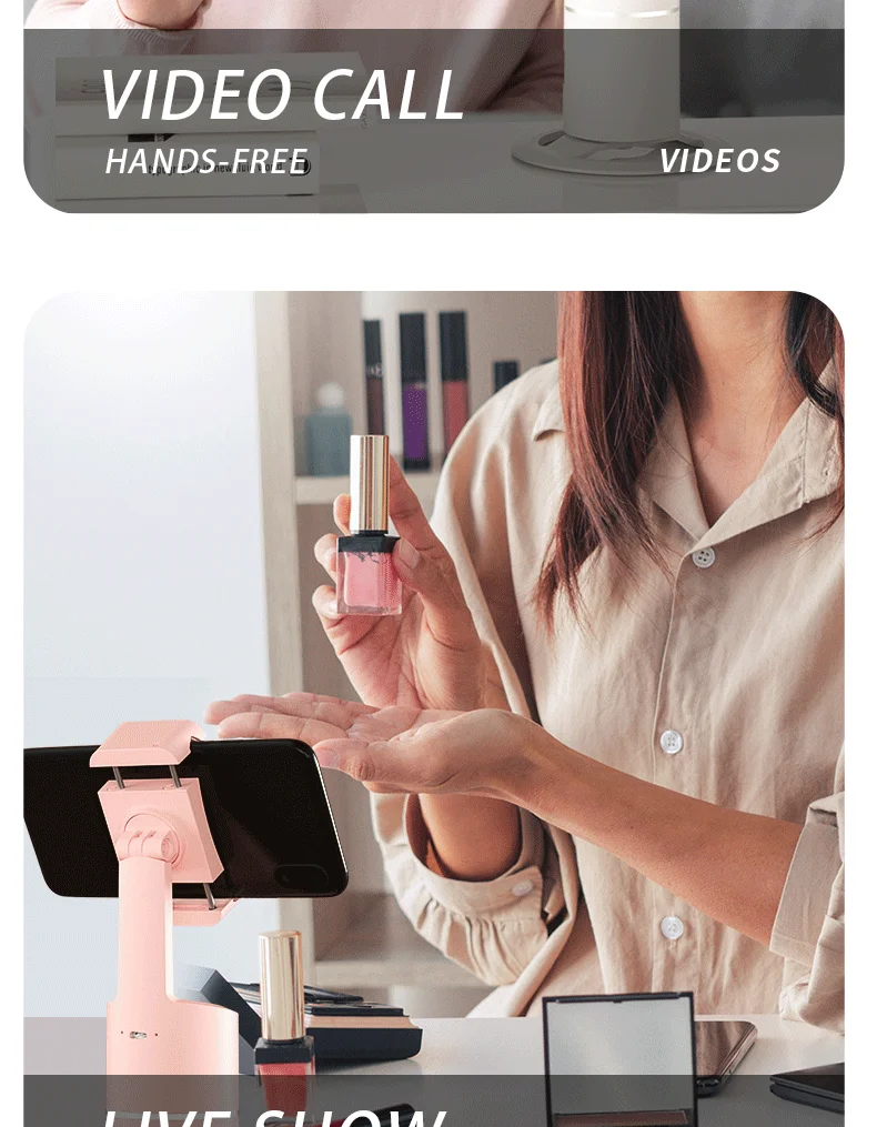 Держатель телефона для отслеживания имеет систему отслеживания, встроенная камера может обнаруживать движение людей. Когда вы двигаетесь перед камерой, он может распознавать и отслеживать ваше лицо или тело, даже когда вы вернулись к камере. Он может вращаться вместе с вами.