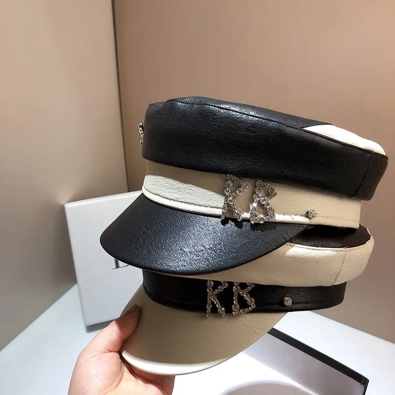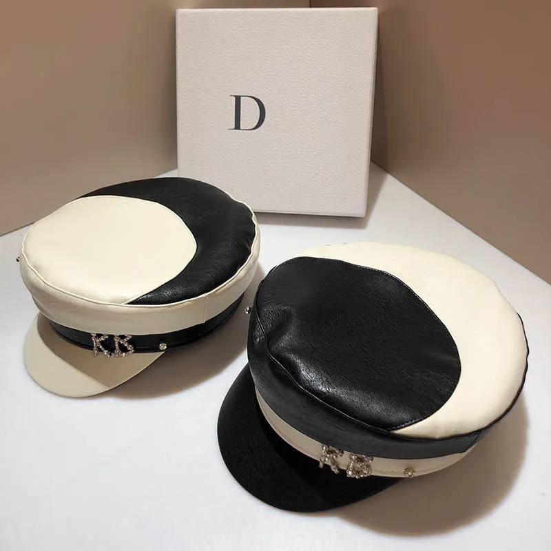 Hats For Women Fashion Military Hat Black White Patchwork PU Leather Navy Cap Lady Beret Casual Caps Tide Rhinestones Sailor Hat