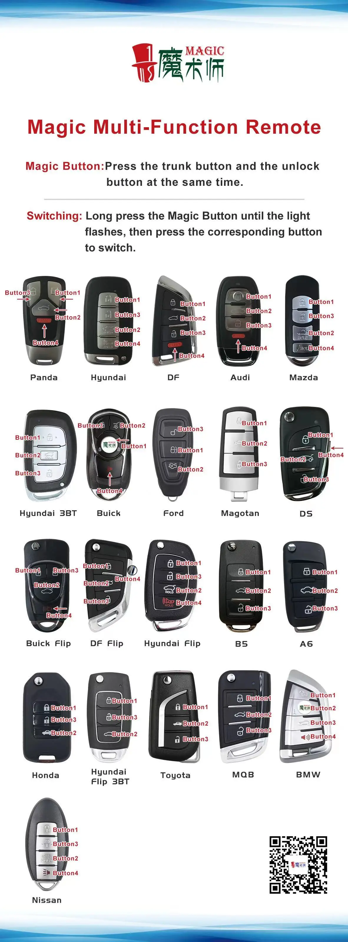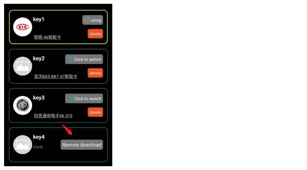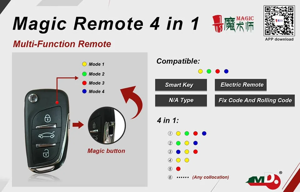 Положение антенны: Управление идентификацией или программированием, пожалуйста, поместите магиюУдаленное Вертикальное Устройство, чтобы убедиться, что устройство может читать данныеКнопка 1: БлокировкаКнопка 2: кнопка заднего багажника/кнопка поиска автомобиля/кнопка запуска двигателя (конкретныйФункция кнопки связана с моделью)Кнопка 3: разблокировкаКнопка 4: волшебная кнопка (также есть кнопка заднего багажника/кнопка поиска автомобиля/стартКнопка двигателя (специальная функция кнопки связана с моделью)3. Загрузка и установка приложения