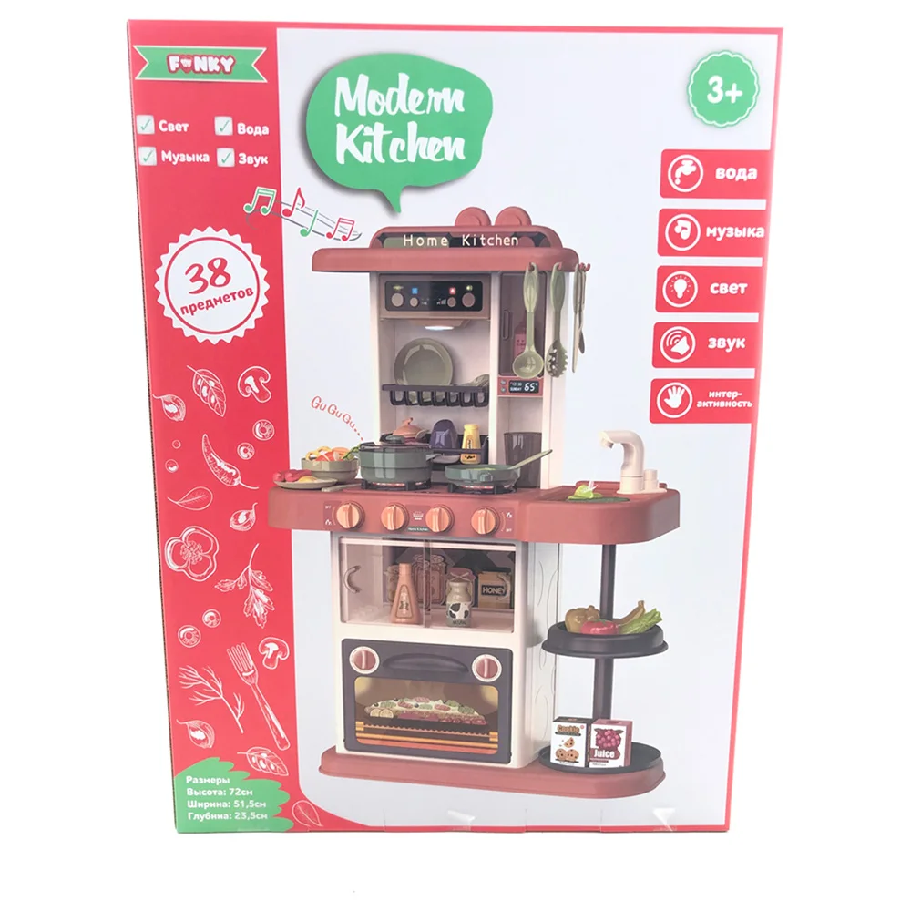 Перед вами детская кухня, которая собирается до размеров 51,5*23,5*72см. Большая кухня с функцией света, звука, музыки и подачи воды порадует вашего маленького повара. Особенностями кухни являются две конфорки плиты с подсветкой и звуками приготовления пищи. Также кран мойки оборудован системой подачи воды.