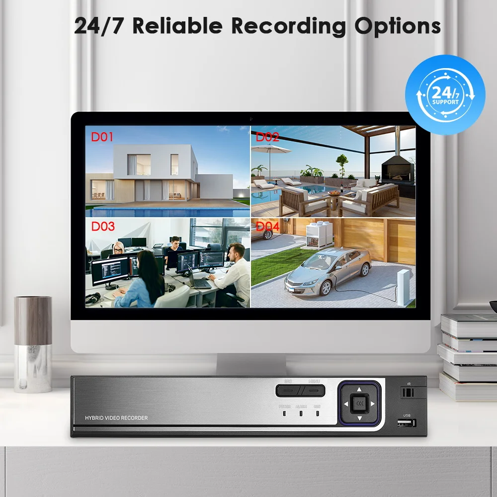 Комплект поддерживает циклическую запись в течение 7x24 часов, запись с детектором движения и другие режимы записи, вы можете воспроизводить запись для просмотра;