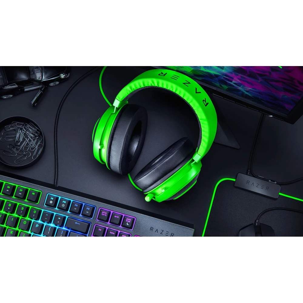 Тип устройства: наушники Вид: полноразмерные Тип: динамические Диапазон воспроизводимых частот: 20 - 20000 Гц Диаметр мембраны: 50 мм Тип крепления: оголовье Разъем наушников: mini jack 3.5 mm Длина кабеля: 1.3 м Совместимость: кроссплатформенная Razer Kraken Multi-Platform RZ04-02830100-R3M1 представляет собой обновленную версию профессиональной геймерской гарнитуры полноразмерного типа с выдвижным микрофоном. Наушники имеют стильное оформление и выполнены из качественных материалов. Модель получила увеличенное по толщине оголовье, облегченный алюминиевый каркас и амбушюры, наполненные охлаждающим гелем. Игровая гарнитура протестирована профессиональными геймерами, в результате чего производитель подобрал идеальный вес для длительной игры и максимального удобства использования. Она подключается посредством аудиоразъема 3.5 мм и является кроссплатформенной. Дизайн Игровая гарнитура Razer Kraken оснащена двумя точно настроенными 50-миллиметровыми динамиками с неодимовыми магнитами, благодаря которым обеспечивается качественное звучание на всем диапазоне воспроизводимых частот. Закрытая конструкция наушников обладает отличной звукоизоляцией и позволяет сконцентрироваться на игре или разговоре. Наличие мягких амбушюр, обтянутых искусственной кожей, обеспечивает более качественную звукоизоляцию и повышенный комфорт использования. В левой чашке наушников находится телескопический микрофон, который можно выдвигать только при необходимости. Такая конструктивная особенность обеспечит полный комфорт при использовании аксессуара. Направленный кардиоидный микрофон обеспечивает прекрасный чистый звук во время разговора. Особенности: Обновленный дизайн Мультиплатформенная совместимость Амбюшуры с охлаждающим гелем внутри Увеличенное оголовье Отличная звукоизоляция Выдвижной микрофон Алюминиевый корпус