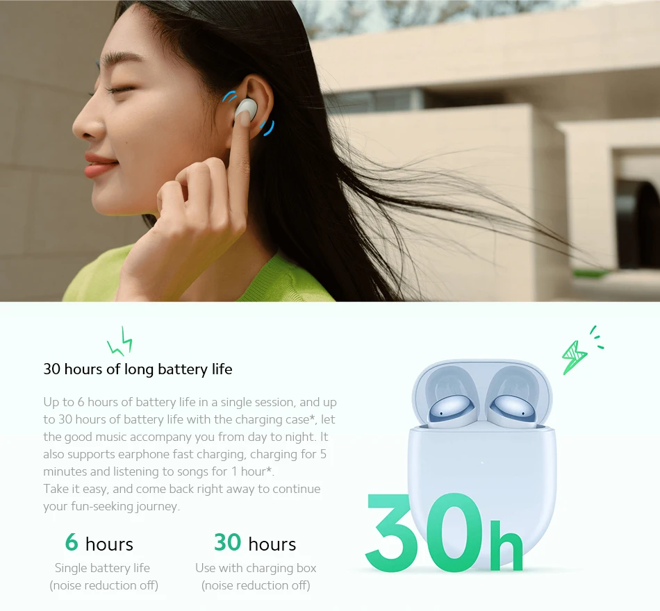 Время непрерывной работы (50% громкости): 6h ANC (наушники)/30h ANC OFF (с зарядный чехол)