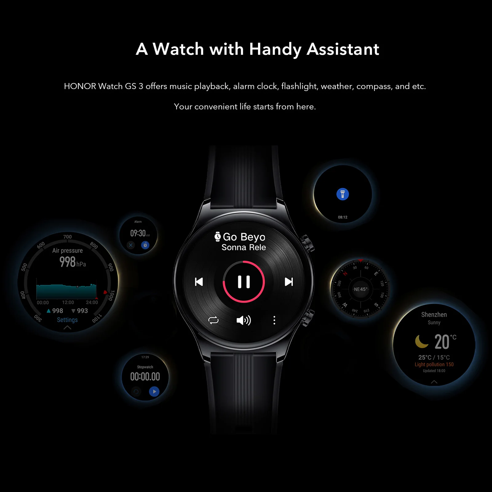 Удаленное управление камерой, дыхательные упражнения, компас, давление воздуха в режиме реального времени, погоду, секундомер, таймер, будильник, функция «найти телефон», фонарик, и т. д.