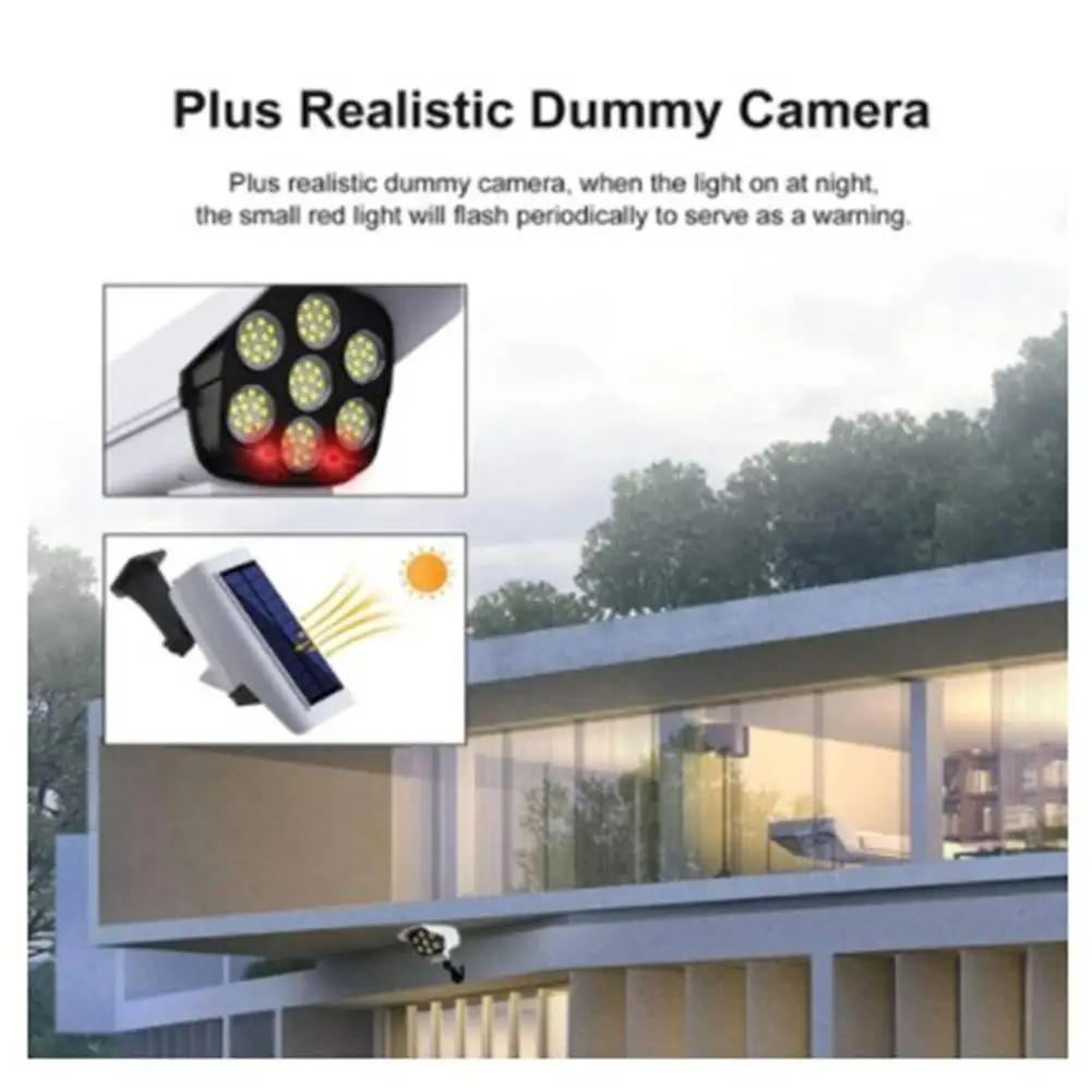 Держите дом в безопасности от нарушителей. Оснащен 77 яркими светодиодами с активированным движением и реалистичными виртуальными камерами безопасности. Мигающий красный предупреждающий светильник ночью для обнаружения нарушителей вдали от вашего дома