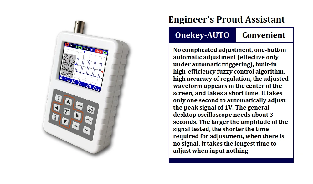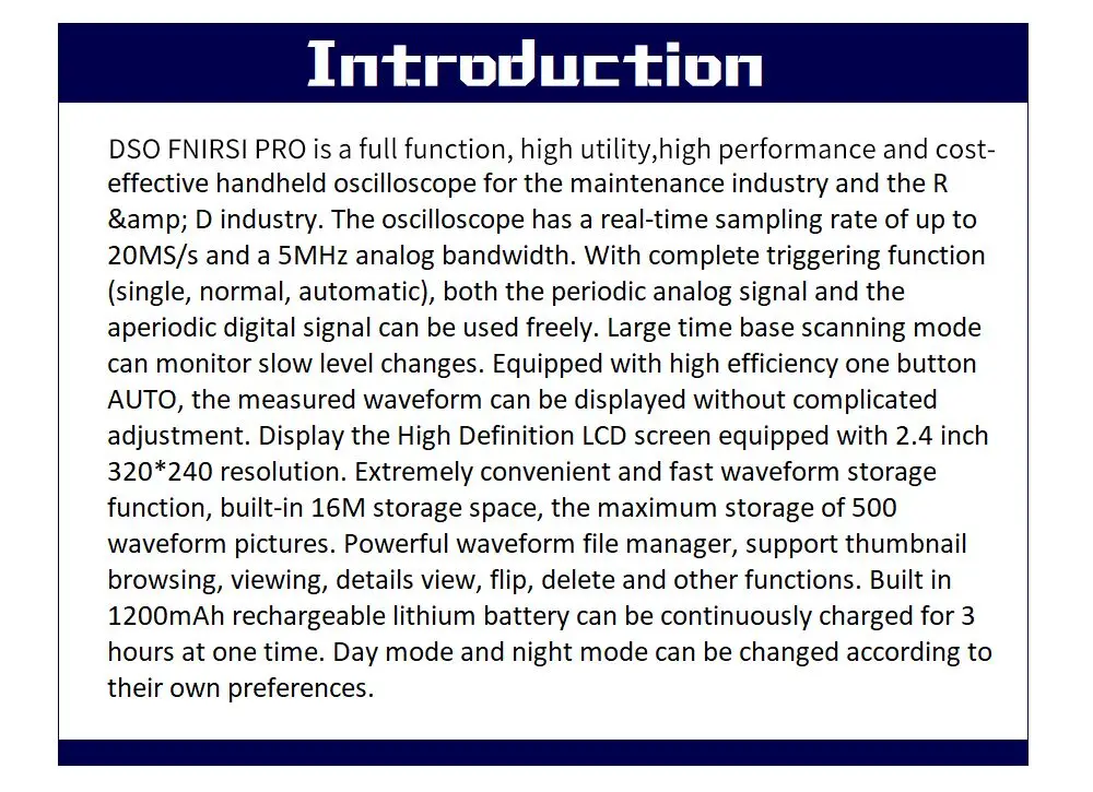 DSO FNIRSI PRO-это полнофункциональная, Высокоэффективная, высокопроизводительная и экономичная ручная осциллограф для отрасли технического обслуживания и НИОКР. Осциллограф имеет частоту дискретизации в реальном времени до 20 мс/с и аналоговую пропускную способность 5 МГц. С полной функцией запуска (одиночный, нормальный, автоматический), можно свободно использовать как аналоговый сигнал, так и аперитив цифрового сигнала. Режим сканирования с большой базой времени может контролировать медленные изменения уровня. Оснащен высокой эффективностью одной кнопкой авто, измеренная форма сигнала может отображаться без сложной регулировки. Дисплей в Высокое разрешение ЖК-дисплей экран оснащен 2,4 дюймов 320*240 разрешение. Чрезвычайно удобная и быстрая функция хранения сигналов, встроенная память объемом 16 Мб, Максимальная память 500 изображений формы волны. Мощный файловый менеджер waveform, поддержка просмотра эскизов, просмотра, просмотра деталей, переворачивания, удаления и других функций. Встроенный перезаряжаемый литиевый аккумулятор емкостью 1200 мАч может непрерывно заряжаться в течение 3 часов одновременно. Дневной режим и ночной режим могут быть изменены в соответствии с их собственными предпочтениями.