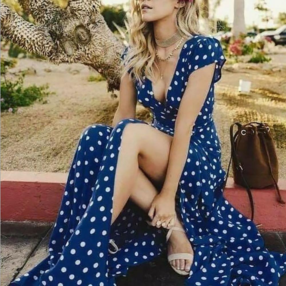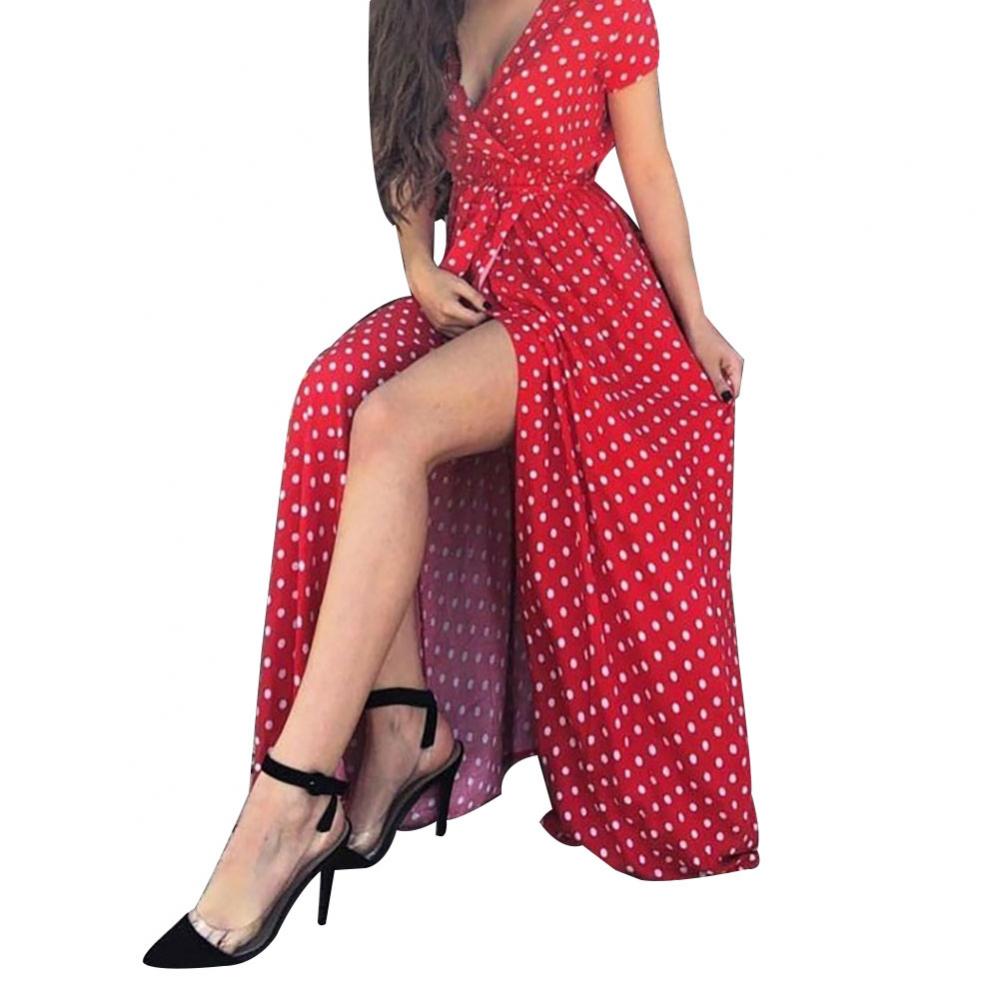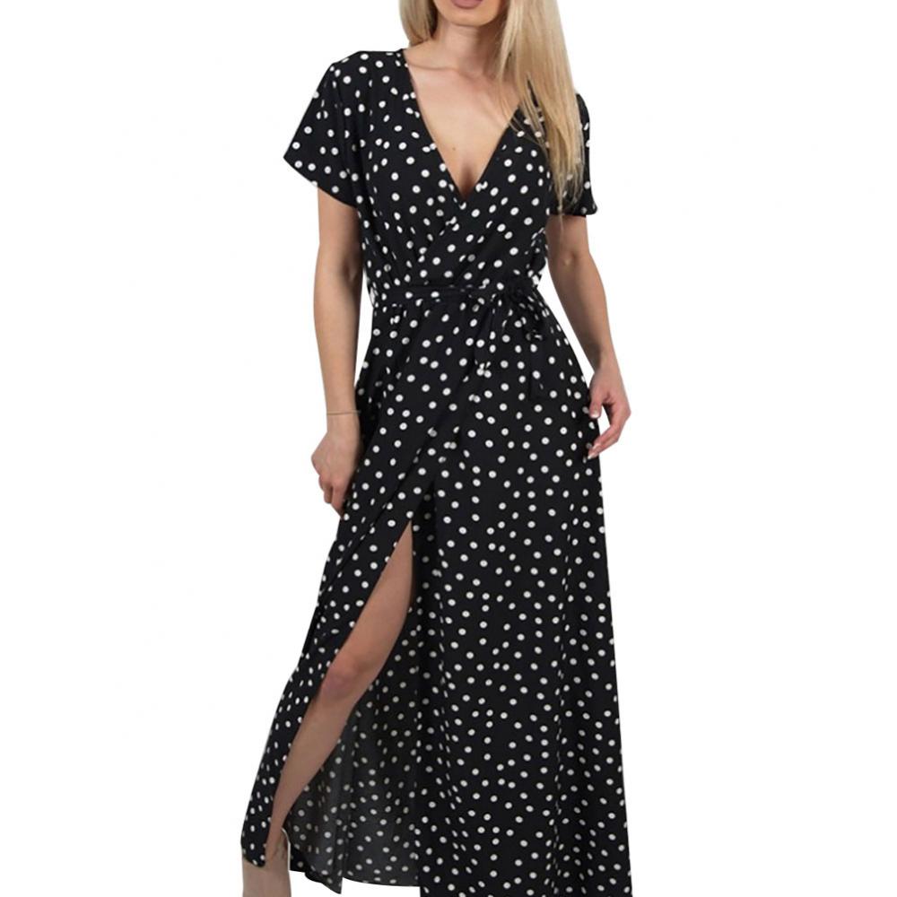 Летние женские пляжные вечерние платья в горошек с глубоким v-образным вырезом и коротким рукавом