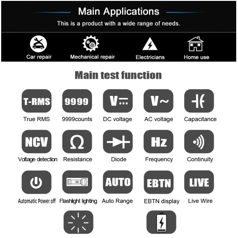 Широкий спектр применения: Этот мультиметр является удобным инструментом, который помогает тестировать, устранять проблемы, решать различные автомобильные и повседневные бытовые электрические проблемы безопасно, точно.