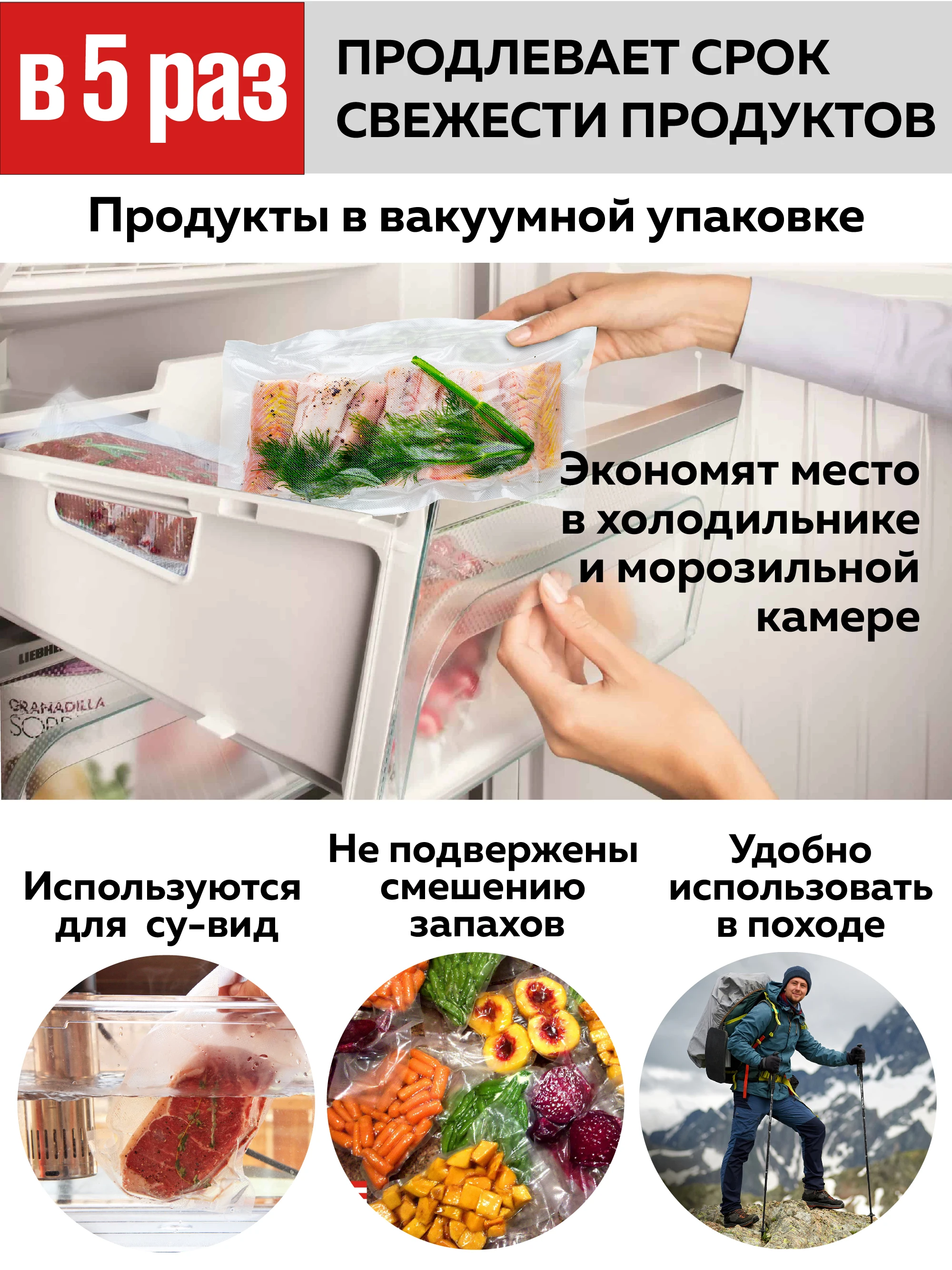 •ПОМОГАЕТ СЭКОНОМИТЬ ДЕНЬГИ И МЕСТО ДЛЯ ХРАНЕНИЯ – продукты, упакованные в вакуумные пакеты, сохраняют свежесть в 5 раз дольше и занимают меньше места в холодильнике и морозильной камере.