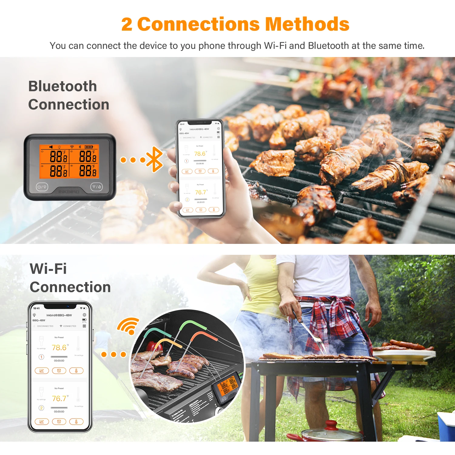 ☼2 способа подключения: устройства поддерживают подключение по Bluetooth и Wi-Fi соединение, вы можете подключить устройство к вашему телефону через Wi-Fi (2,4 ГГц Wi-Fi только) и Bluetooth в одно и то же время. Обновите данные о температуре 4 раза в секунду, максимум 4 зонда за раз, поддерживает калибровку.