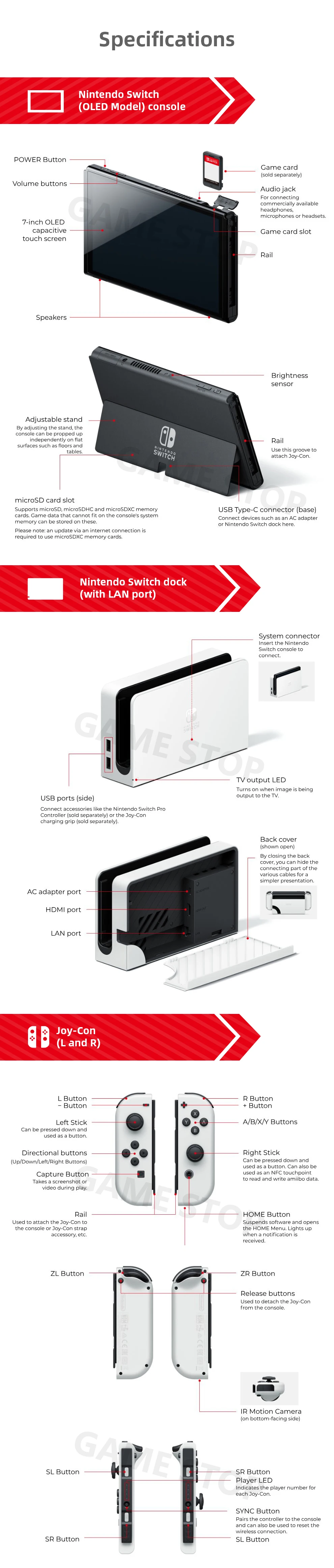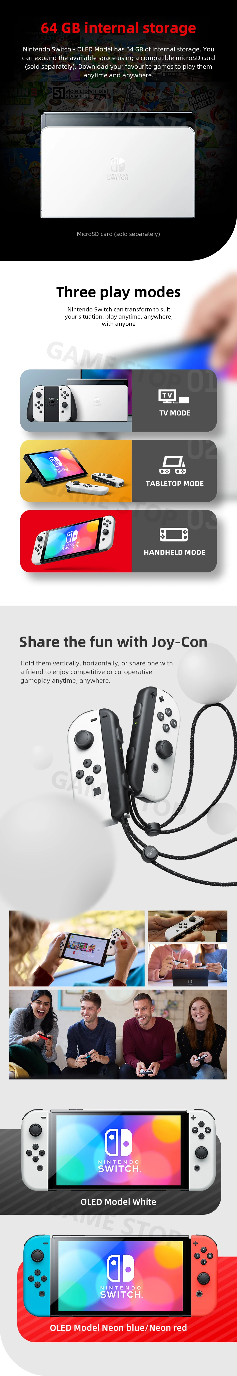 В дополнение к новому экрану с яркими цветами и резким контрастом, модель Nintendo Switch - OLED включает широкую регулируемую подставку для более удобных углов обзора, док-станция с проводным портом LAN для ТВ-режима (LAN кабель продается отдельно), 64 Гб встроенной памяти, И улучшенное аудио в ручных и настольных режимах с использованием динамиков системы.