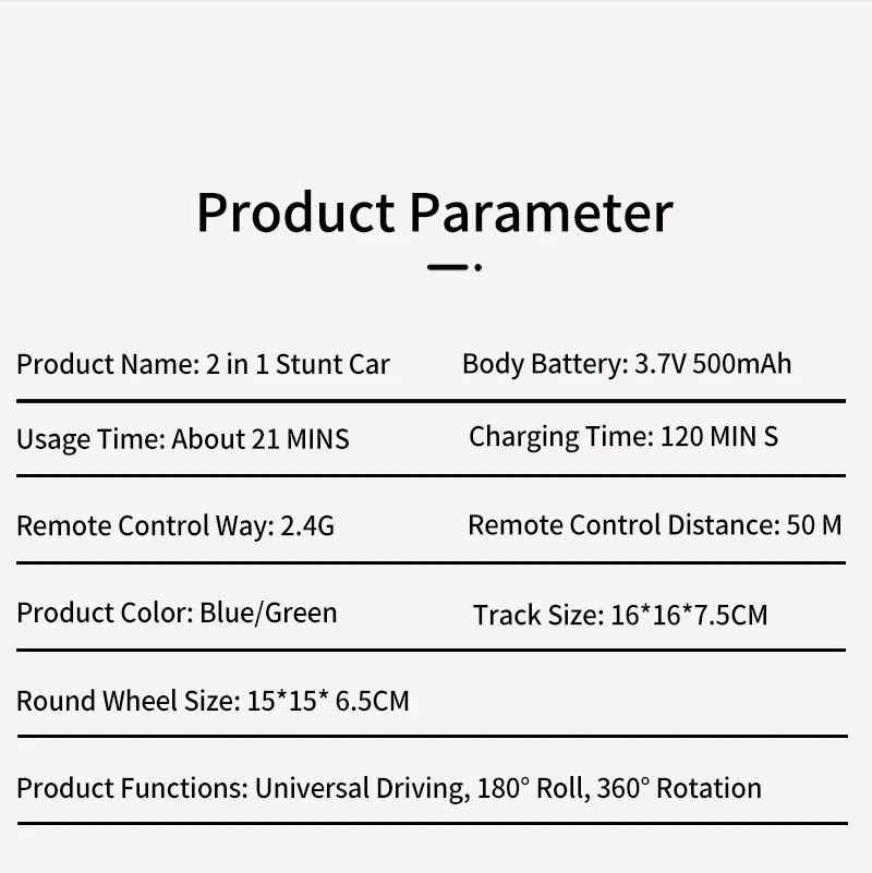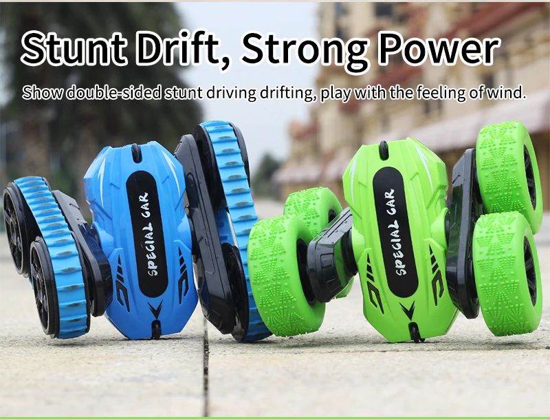 1. 360° rotating stunt, double-sided driving, forward, backward, left turn, right turn, 360-degree rollover, 180-degree flip, provide different gaming experience on this electric remote control stunt car. You can use the remote control to control the children's remote control car in any direction.