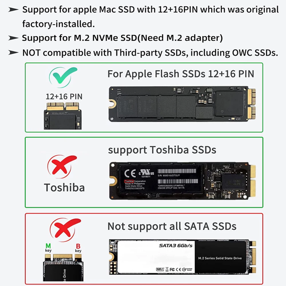 Поддержка 16 + 12pin Macbook Air/Pro SSD, он также совместим с жестким диском с протоколом M.2 NVMe (необходимо установить прилагаемый адаптер)