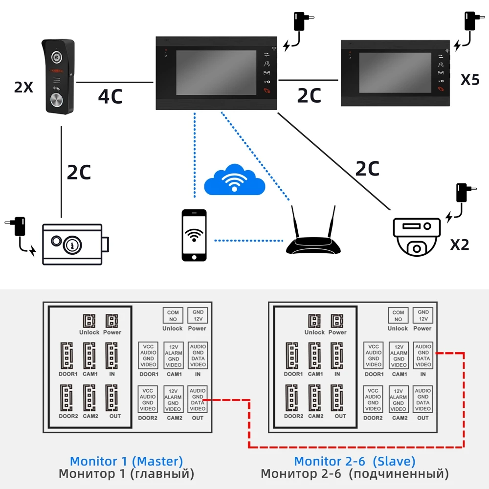 8. 1 монитор поддерживает 2 Дверных звонка + 2 камеры, поддерживает 5 подчиненных подключенных мониторов