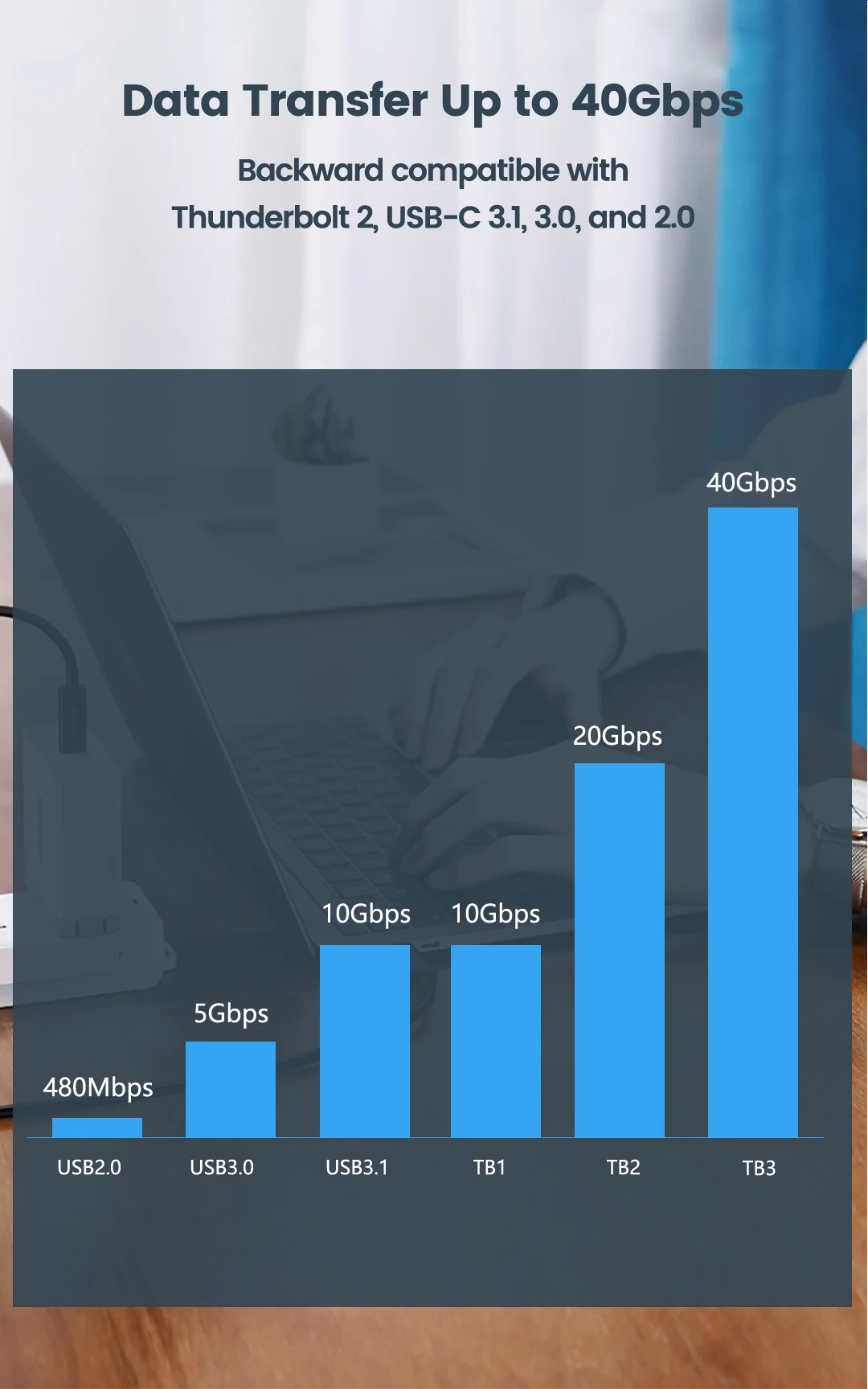 Поддерживает удивительную скорость передачи данных до 40 Гбит/с, 8x быстрее, чем стандартный кабель USB C