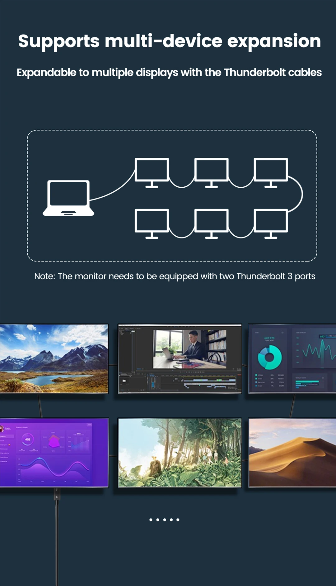 【Одиночный 5K или двойной 4K 】-поддержка подключения двух мониторов одновременно на 4K x 2K(4096x2160)@ 60 Гц разрешение видео или один монитор при 5K (5120x2880)@ 60 Гц. Обратите внимание, что при подключении к порту USB C для видеовыхода убедитесь, что ваш порт USB C sup s Display port Альтернативный режим (режим Alt). Эта установка может производить только один дисплей 4K.