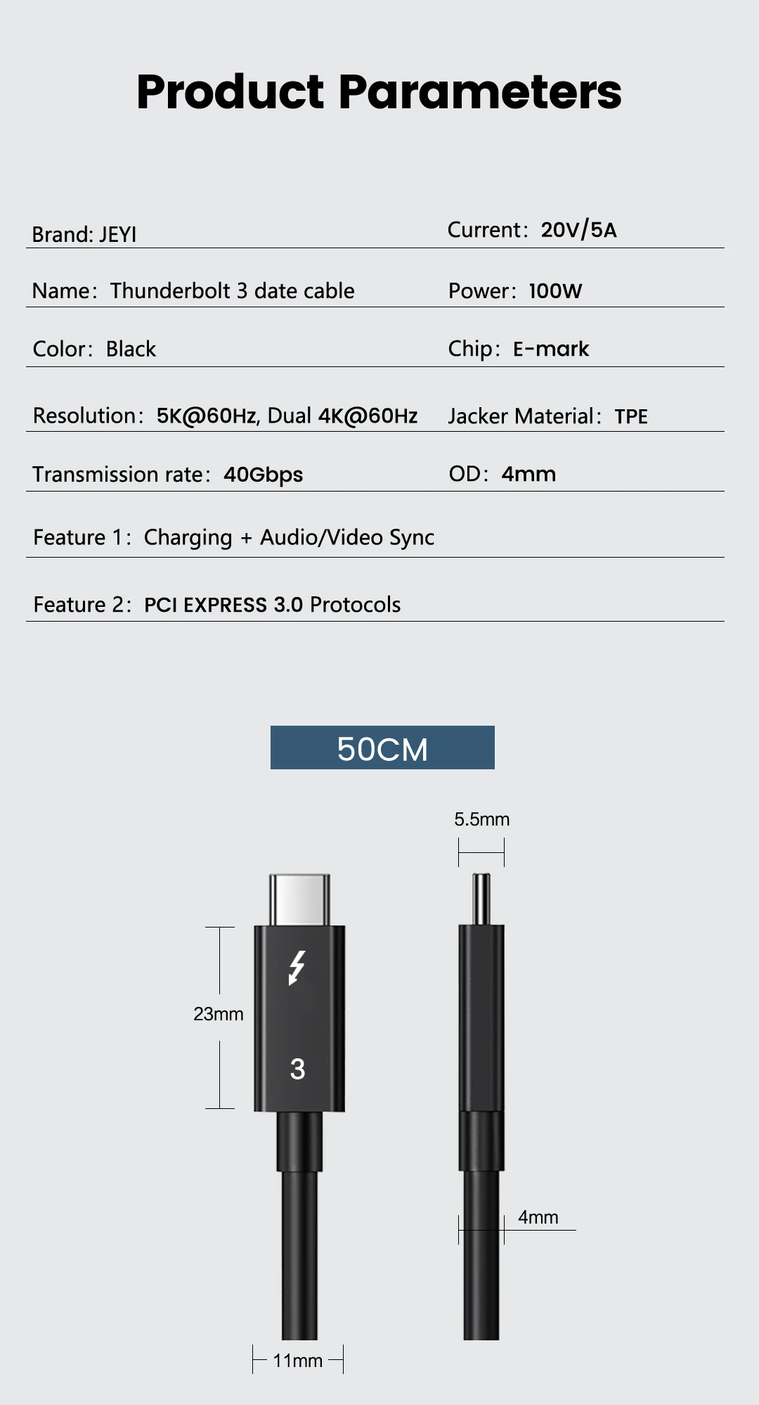 【Intel Сертифицированный JEYI Thunderbolt 3 кабель】-поддерживает удивительный со скоростью до 40 Гбит/с, передачи данных, он может копировать 14 часов видео высокой четкости или 25000 фото при температуре 40 Гбит/с в течение 1 минуты, подключи и работай, не нужно устанавливать вилки. (Обратите внимание: фактическая скорость передачи должна соответствовать используемому оборудованию)