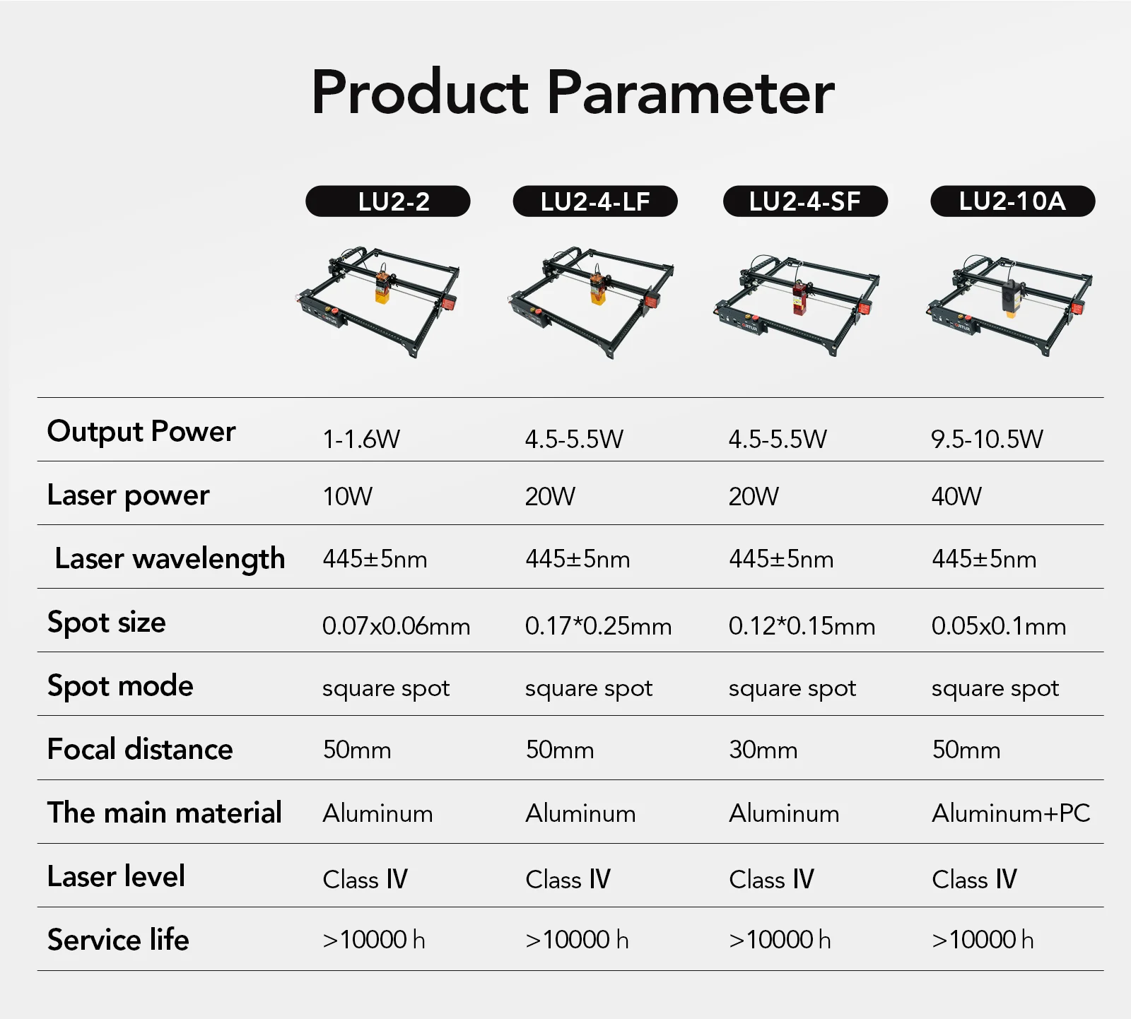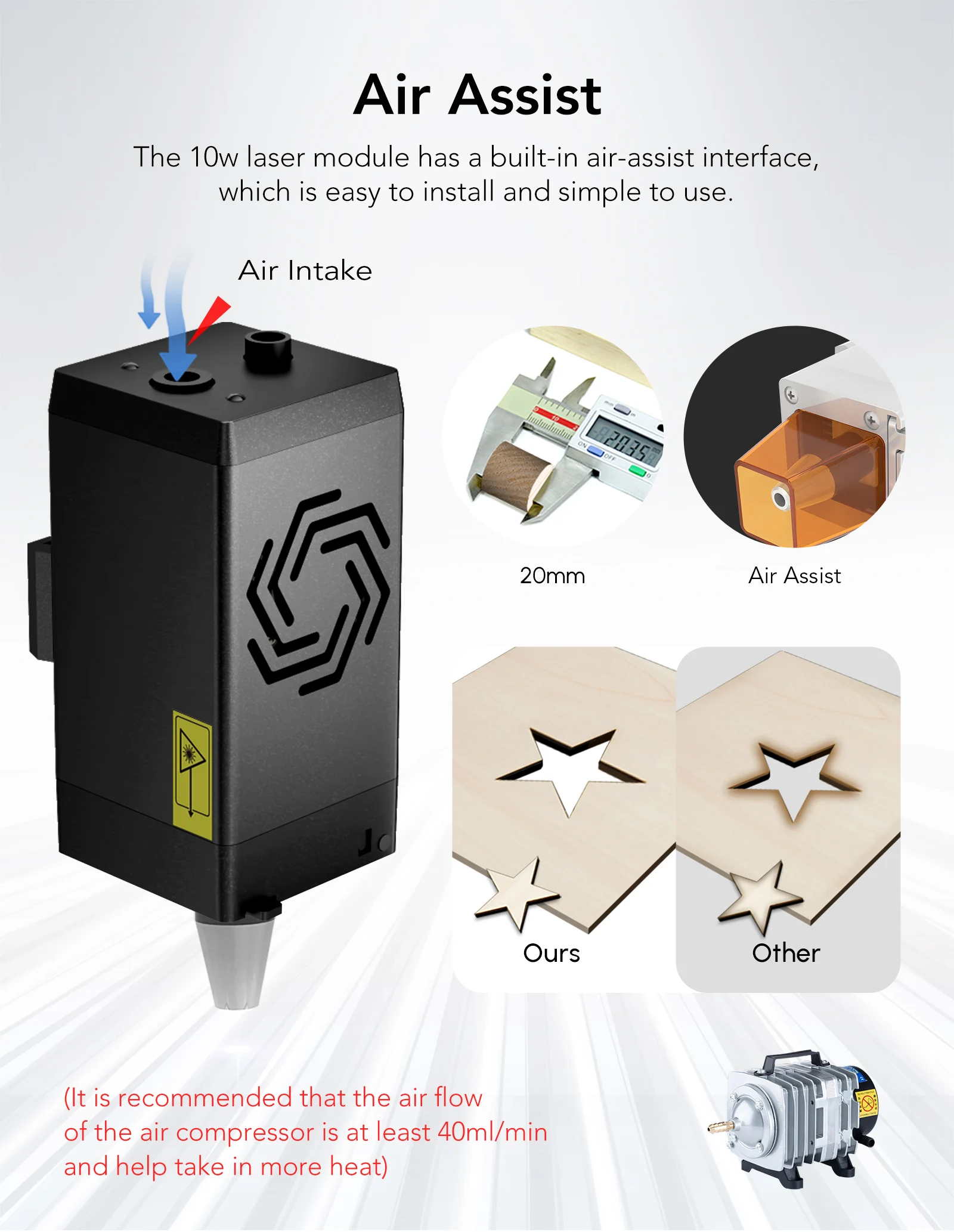 Покупатели только заказывают воздушный компрессор самостоятельно для LU2-4 LF лазерной формы. LU2-10A с реальной лазерной мощностью 10 Вт, она может прорваться через акрилы 30 мм. И резать через фанеру 15 мм и акрилы за один проход.