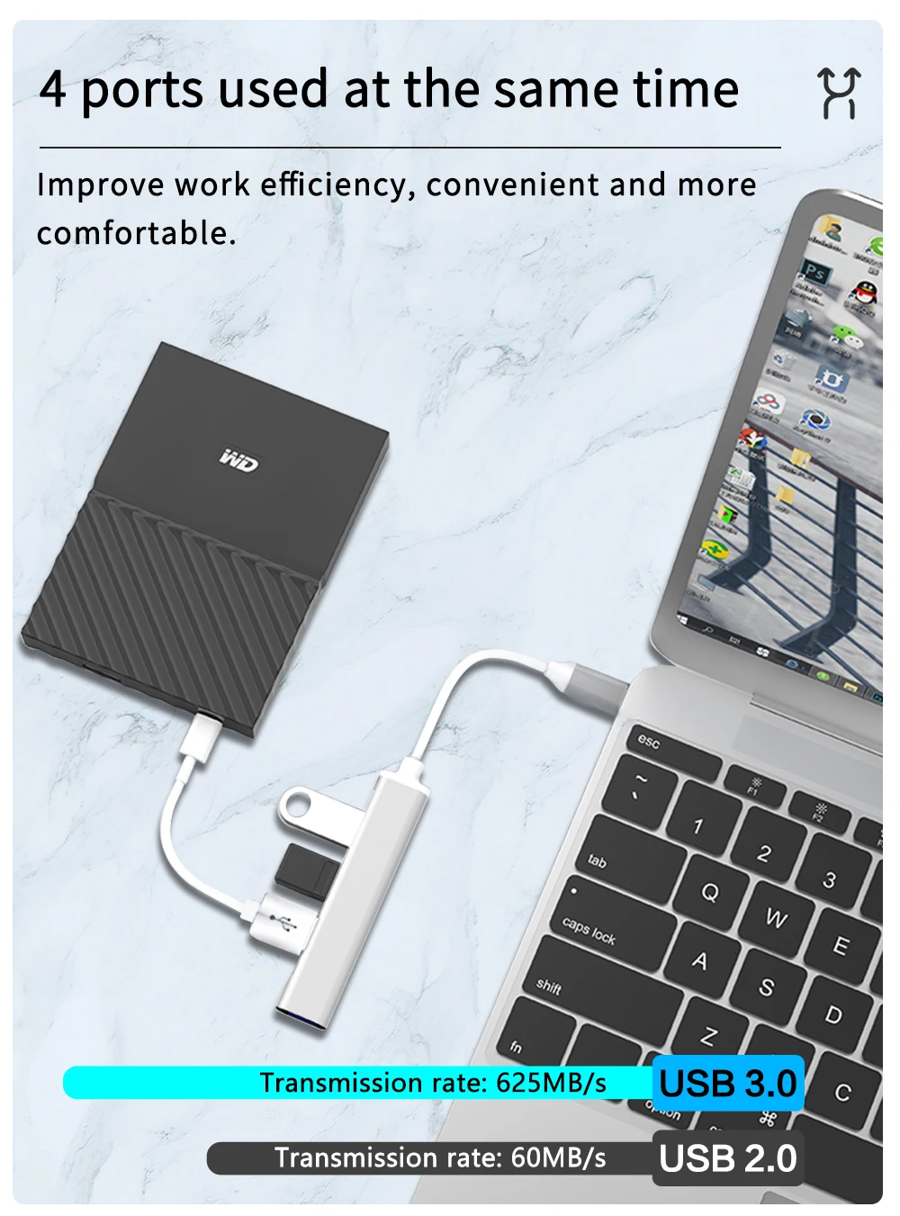 Расширение продукта 1 * USB 3,0 + 3 * USB, USB-кардридер, U-диск, мобильный жесткий диск, Считывание данных и простое подключение USB, внешних устройств, таких как мышь, клавиатура, геймпад, принтер, И т. Д.