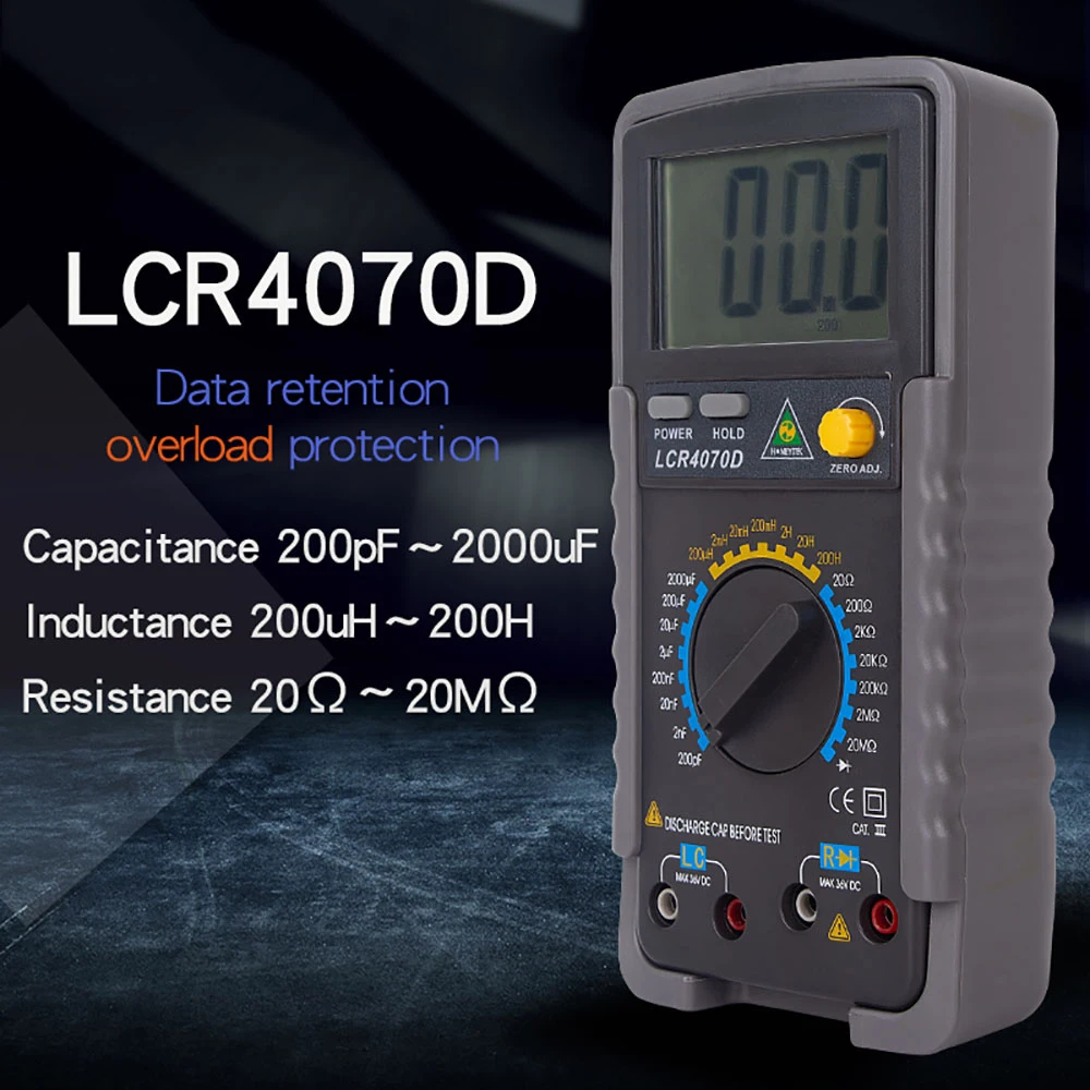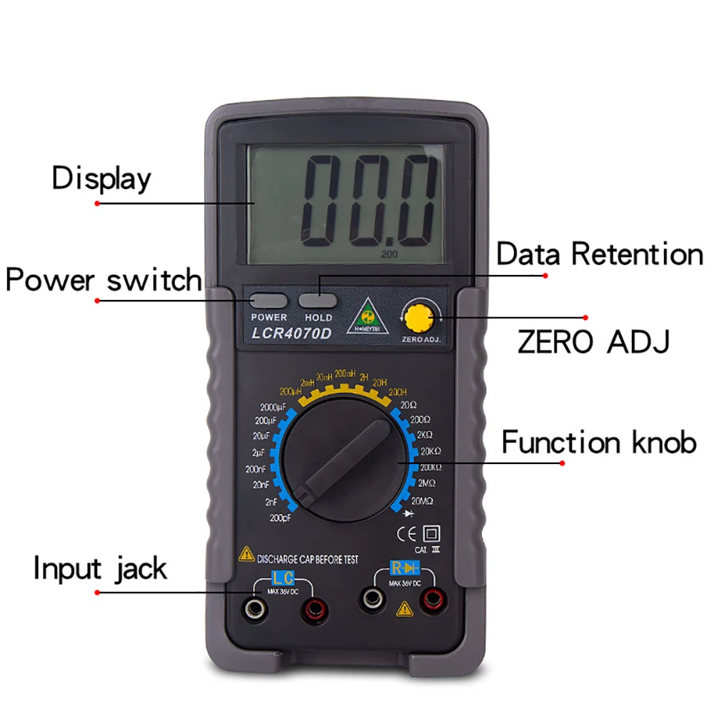 Диапазон измерения: 200pF ±(1.0% + 10d);2000pF/20nF/200nF/2 мкФ/20 мкФ/200 мкФ ±(0.5% + 5d);2000 мкФ Ф ±(2.0% + 10d);20 МФ ±(4.0% + 10d)