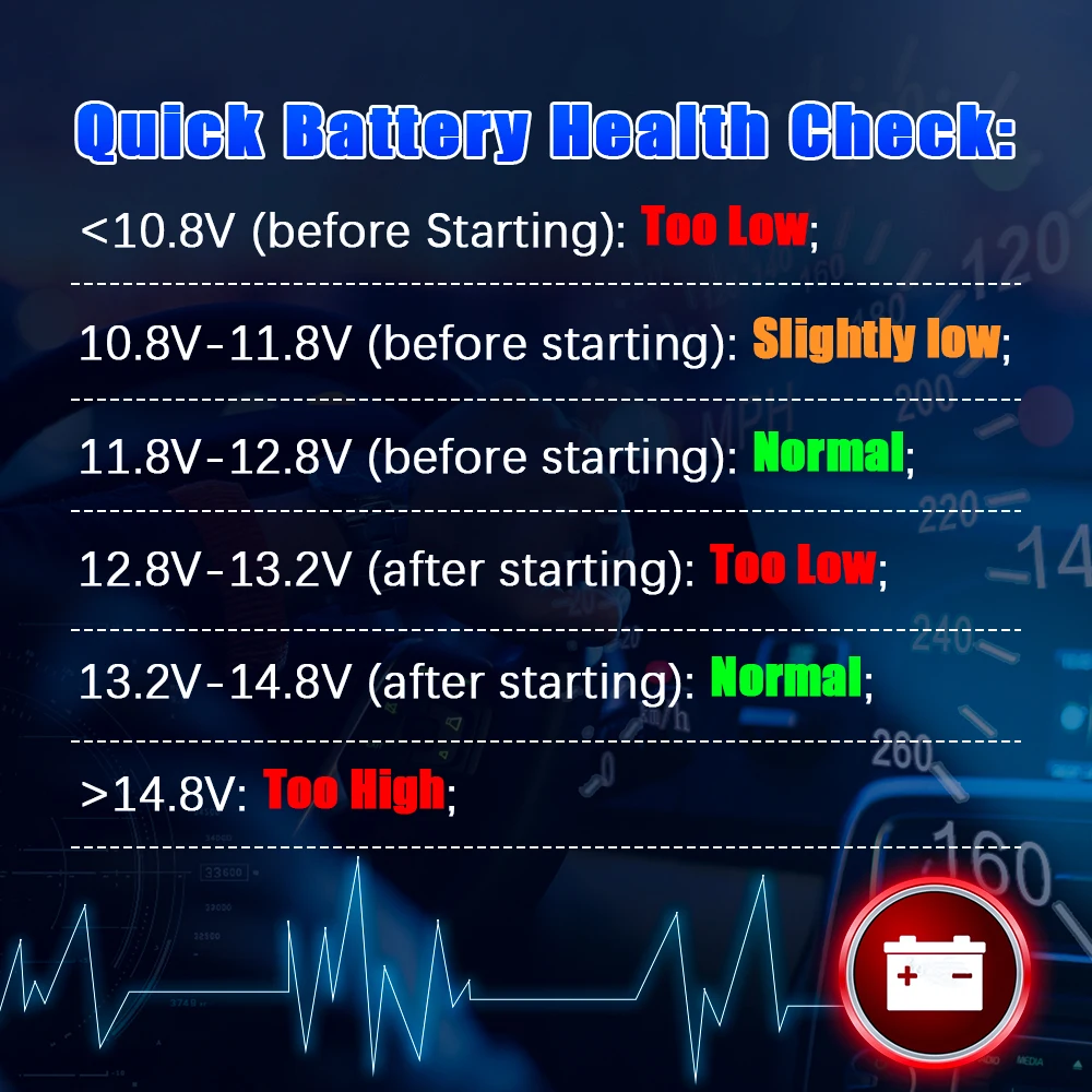 A, <10,8 В (перед запуском): слишком низкий; Измените аккумулятор, в противном случае, может быть не в состоянии начать;