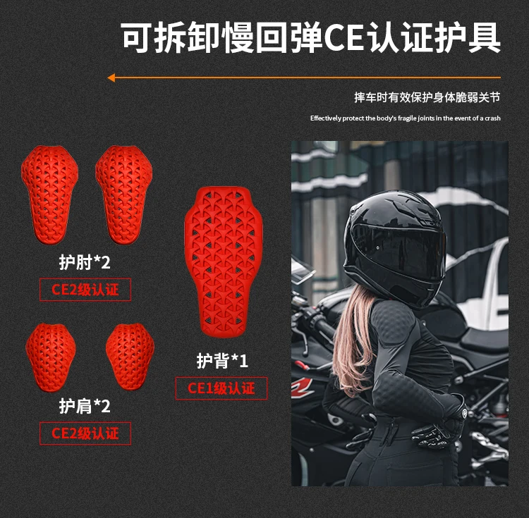 * 5 единиц защитной экипировки: Налокотники * 2 (Сертификация CE 2); Наплечные упоры * 2 (Сертификация CE 2); Задние накладки * 1 (Сертификация CE 1)