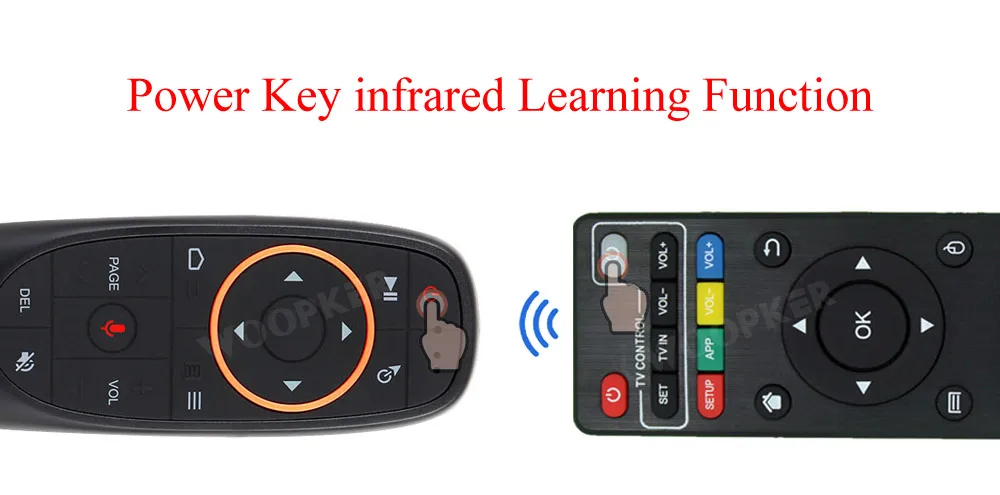 2. Направьте на ИК-передатчик air mouse и TV remote, нажмите кнопку «Power» на пульте дистанционного управления ТВ, В светодиодный светильник air mouse будет светильник (до тех пор, означает, что воздушная мышь получила при помощи инфракрасного излучения, код)