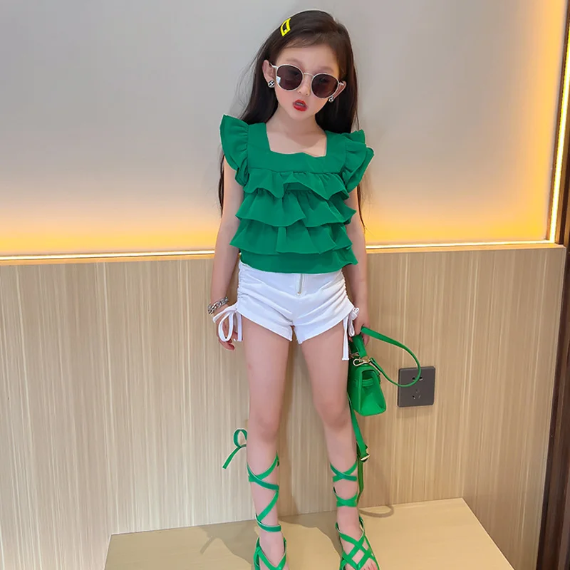 Name: Summer Girls Blouse Baby Tops Kids Blouse For Toddler Children Clothes Fashion Flying Ruffle Layered Solid 4-13Y
