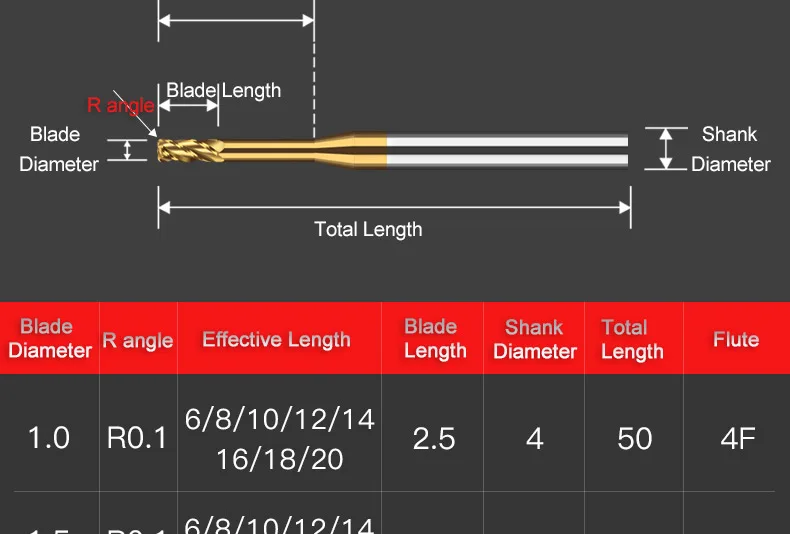 Micro Corner Radius End Mill Long Neck 1.5mm R0.1 R0.2 Mini Carbide CNC Cutting Deep Groove Corner Roughing Milling Cutter Tool 4 Flute 4 Flutes HRC60 1mm 2mm 3mm