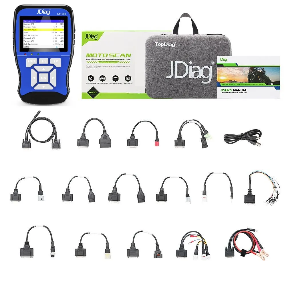 Original JDiag M100 Motorcycle Diagnostic Tool Universal Motorbike Scanner 2in1 Motor Scan Battery Tester Free ShippingDescription :M100 Moto Scanner is the new generation Handheld Motorcyle diagnostics tool, it covers virtually all major manufacturers' diagnostic functions. It helps the technician to diagnose problems and make repairs faster;many common procedures are written into the tool so the technician can follow them (injectors, ignition, coils, fuel pump, etc.). It allows the technician to perform factory service procedures such as re-setting the service light, encoding keys, unlocking the immobilizer and configuring the immobilizer/alarm, making injection adjustments (COTrimmer), adjusting the throttle valve position sensor(TPS),re-setting auto adaptive parameters, and making idling adjustments. The tool shows live data, displays ECUdata, reads stored faults(history) or live data (RPM,batteryvoltage,throttleangle). Supported Motorcycle list:for H-artford, for Aeon, for Honda, for SYM, for Yamaha, for Suzuki, for Kymco, for Kawasaki, for Piaggio, for PGO,for KTM, etc Supported Languages:English , Chinese, Thai, Indonesian, Vietnamese, SpanishFeatures: 1, Handheld operation, convenient and flexible to use2, Support for SD cards to store data and upgrades,3, Reserved CAN bus interface4, 3.2-inch color screen, clear display.6Dynamic data with numerical and waveform. Functions: 1. Read system information2. Read data stream3. Read fault code4. Erase fault code5. Freeze data6. CO idle speed adjustment7. Actuators test8. ABS system test9. Trouble shooting guidance10. Tire pressure system test11. Anti-theft system test Specifications: Power: DC10-15VOperating Current: 250mAStorage temperature: -10 C to 85 COperating temperature: 0 C to 70 CHumidity: <90%Upgrade Ports: USB portCommunication ports: COM port Package List:1.Basic Version :