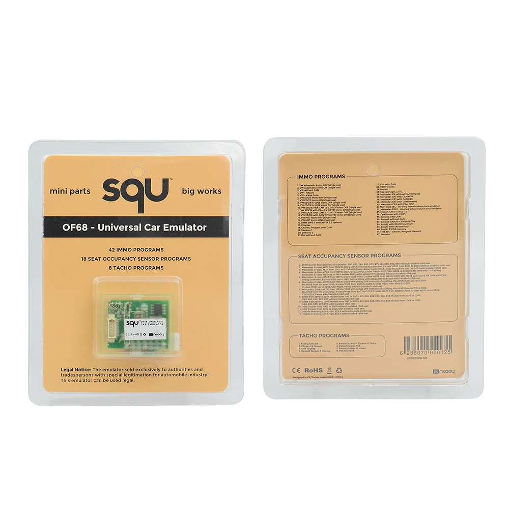 10pcs/lot Hot SALE Universal SQU OF80 OF68 Car Emulator Diagnostic Supports For IMMO/Seat Occupancy Sensor diy Best PriceSQU OF68 Universal Car Emulator SQU OF68 Car Emulator Signal Reset Immo Programs Place ESL Diagnostic Seat Occupancy Sensor Toolthe SQU OF68 Universal car emulator allows you to:remove the original immobiliser signalreplace the original immobiliser signalreplace the ESL, enabling the car to startcheck the EZS on the tablecheck the correctness of the airbag systemstart the tacho on the tableThe SQU OF68 emulator includes 68 programs dedicated to hundreds of car models and types of ECU.You can choose from:immo programsseat occupancy sensor programstacho programsThe vast majority of programs can be used multiple times.Program selection is effected by soldering jumpers from J1 to J7. To connect the emulator, please refer to specific installation manual.* immo programs1. VW automatic immo OFF (single use)2. VW automatic immo ON (single use)3. VW without CAN4. VW - Hit-achi5. VW - Valve Code6. VW EDC15 immo OFF (single use)7. VW EDC15 immo ON (single use)8. VW EDC16 K-LINE immo OFF (single use)9. VW EDC16 K-LINE immo ON (single use)10. VW EDC16 with CAN 1.9 2.0 TDI immo OFF (single use)11. VW EDC16 with CAN 1.9 2.0 TDI immo ON (single use)12. VW EDC16 with CAN 2.7 3.0 TDI immo OFF (single use)13. VW EDC16 with CAN 2.7 3.0 TDI immo ON (single use)14. VW ME7 immo OFF (single use)15. VW ME7 immo ON (single use)16. B-MW EWS II and EWS III 3.2 systems17. Chr-ysler18. Citr-oen, Peuge-ot with CAN19. Dae-woo 120. Dae-woo 221. Fiat without CAN22. Fiat with CAN23. FSO Polonez24. Ho-nda25. Kia Sportage 2.0TD26. Merce-des CR without CAN Infrared27. Merce-des CR1 with CAN WSP28. Merce-des CR1 with CAN EZS29. Mer-cedes CR1 with CAN infrared30. Merc-edes CR2 with CAN WSP31. Merc-edes ESL - steering wheel column lock emulator32. Merc-edes ESL2 - steering wheel column lock emulator33. Ni-ssan NATS 4 and 5 32.34. Opel immo with HC0535. Renault with CAN36. Renault without CAN37. Renault without CAN old ECUs38. Suzuki with X24C01 memory39. Suzuki with OKI memory40. Suzu-ki 93C56 memory41. TMS 374 - Citr-oen, Peug-eot, Renault42. Ya-maha* Seat accupancy sensor programs1: BM-W Europe from 2007 to 2010 Models: E60, E63, E64, E65, E70, E71, E81, E90, E92, E93 without installed child seat2:Merc-edes: E-class W211 from 2002 to 2004 with Temic airbag controller, S-class W220 from 2003 to 2005 without installed child seat3:Merc-edes: E-class W211 from 2002 to 2004 with Temic airbag controller, S-class W220 from 2003 to 2005 with installed child seat4:Merce-des: A-class W168 from 1997 to 2001, C-class W202 from 1999 to 2001, Vito W638 up to 2003, ML 1999 with TRW airbag controller, E-class W210 up to 1999, before lifting with airbag OFF indicator without installed child seat5:Merce-des: A-class W168 from 1997 to 2001-class W168, C-class W202 from 1999 to 2001, Vito W638 up to 2003, ML 1999 with TRW airbag controller, E-class W210 up to 1999, before lifting with airbag OFF indicator with installed child seat6:Merce-des: E-class W210 from 1999 to 2003 with airbag OFF indicator after lifting, Vito W639 from 2002 to 2005, ML W163 from the year 2000, A-class W168 from 2002 to 2005, S-class W220 from 2000 to 2003, C-class W203 up to 2005, CLK W209, Vaneo without installed child seat7:Merc-edes: E-class W210 from 1999 to 2003 with airbag OFF indicator after lifting, Vito W639 from 2002 to 2005, ML W163 from the year 2000, A-class W168 from 2002 to 2005, S-class W220 from 2000 to 2003, C-class W203 up to 2005, CLK W209, Vaneo with installed child seat8:B-MW from 1997 to 2007 , Models from 1997 to 2003: E31, E36, E38, E39, E46, E53Models from 2003 to 2007: E60, E63, E65, E87, E90 . without installed child seat9:B-MW from 1997 to 2007 . Models from 1997 to 2003: E31, E36, E38, E39, E46, E53Models from 2003 to 2007: E60, E63, E65, E87, E90 . with installed child seat10:Mini Cooper from 2002 to 2005 without installed child seat11:Mini Cooper from 2002 to 2005 with installed child seat12:Maz-da: Premacy, MX-5, 626, 323, 6 without installed child seat13:Maz-da: Premacy, MX-5, 626, 323, 6 with installed child seat* Tacho Programs1. A-udi Q7 and A62. Ci-troen C4 Picasso3. EMF Display4. Ren-ault Kangoo 3 Display5. Ren-ault Scenc II, Espace IV Tacho6. R-enault Scenic Full7. Ren-ault Scenic III + Navi8. VW Passat B6packing:- emulator- CD for user manuelweight: 0.02kg