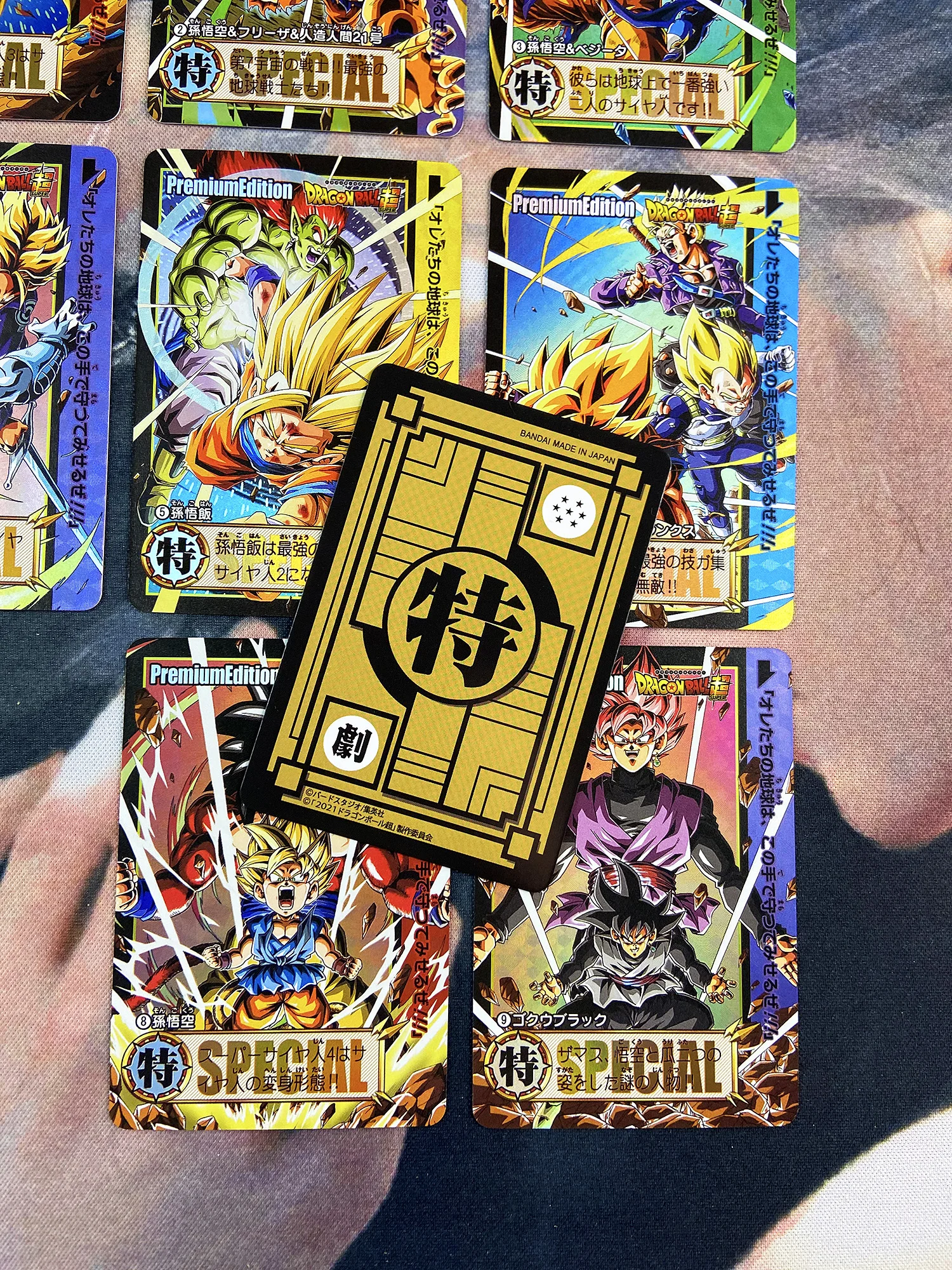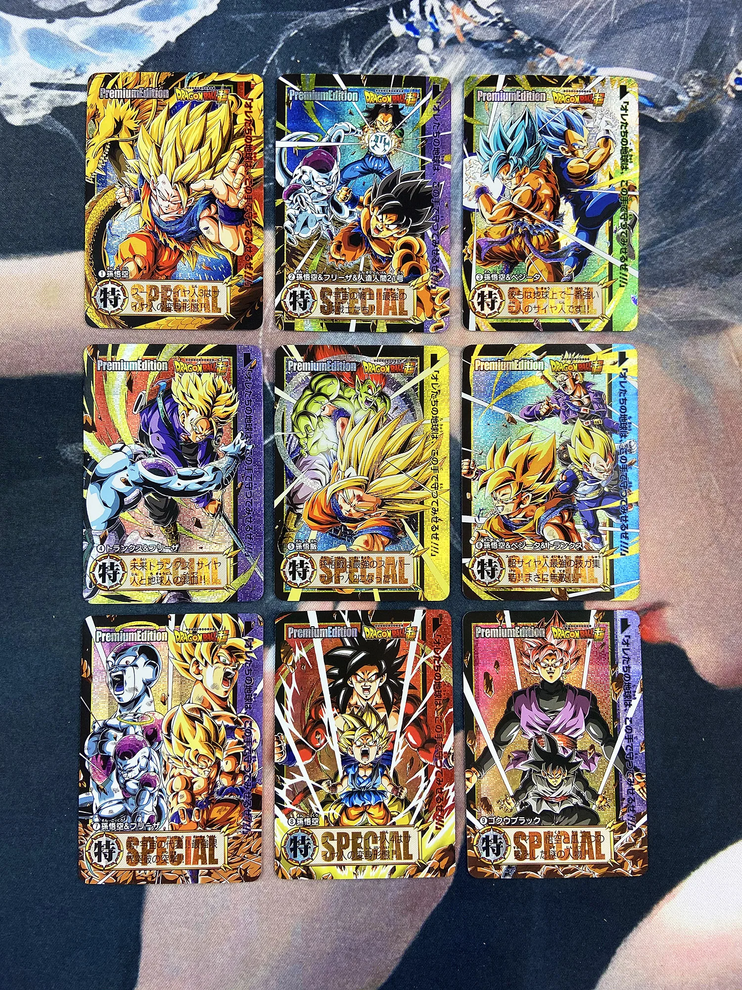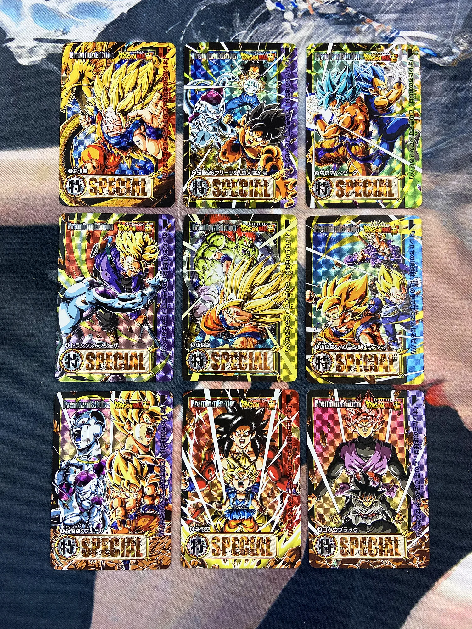 Драконий жемчуг Супер saiyan боевые карты, фронтальный интерфейс и Карта назад от 1 до 1 воспроизведение, высокая четкость перекраски добавки, использование технологии преломления, каждая карта имеет различные узоры и рельефы и матовые. Каждая карта индивидуально разработана и варьируется.