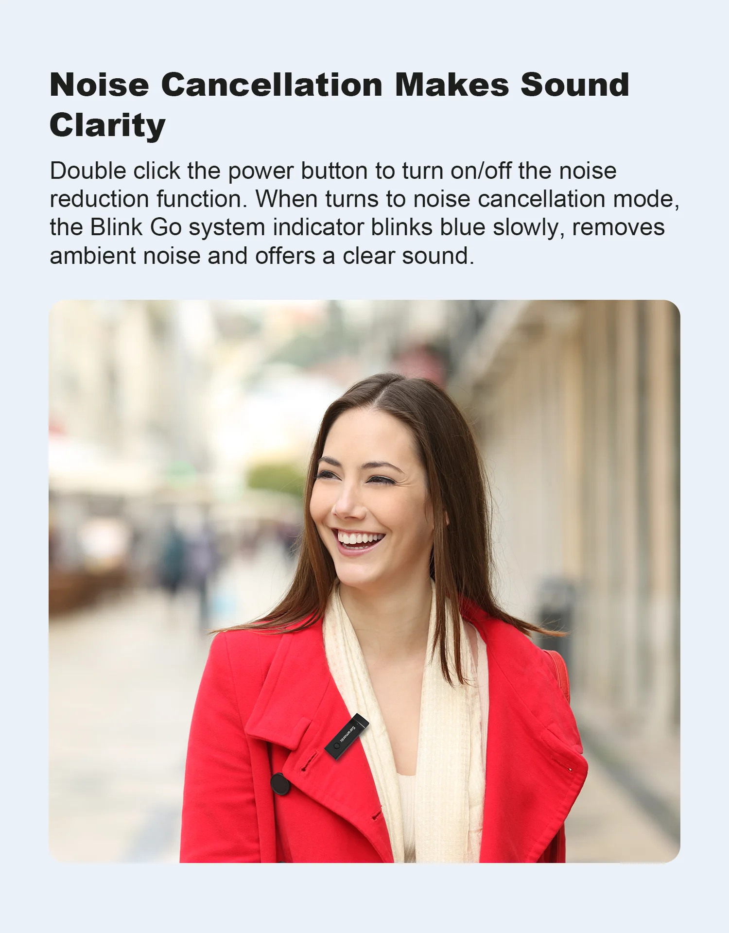 С цифровым 2,4 ГГц трансмиссия, мерцания идет система обеспечивает стабильную и впечатляющим линии визирования ассортимент на глубину до 50 м, для достижения непревзойденной наслаждение звуком для создателей контента. Дважды нажмите кнопку питания, чтобы включить/выключить функцию шумоподавления. При включении режима шумоподавления индикатор системы Blink Go медленно мигает синим цветом, удаляет Окружающий шум и обеспечивает чистый звук.