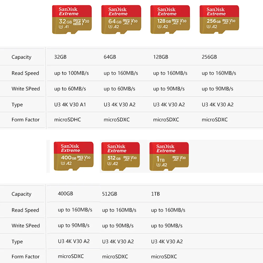 1.Save time transferring contentQuick read speeds of up to 160MB/s* [100MB/s for 32GB] let you transfer 1000 high-resolution photos and 30 minutes of 4K video (24GB) in less than 3 minutes. 2.Capture frames fasterCapture fast-action photos or shoot 4K UHD video with write speeds of up to 90MB/s.* The SanDisk Extreme microSDXC UHS-I Card lets you shoot more and faster.