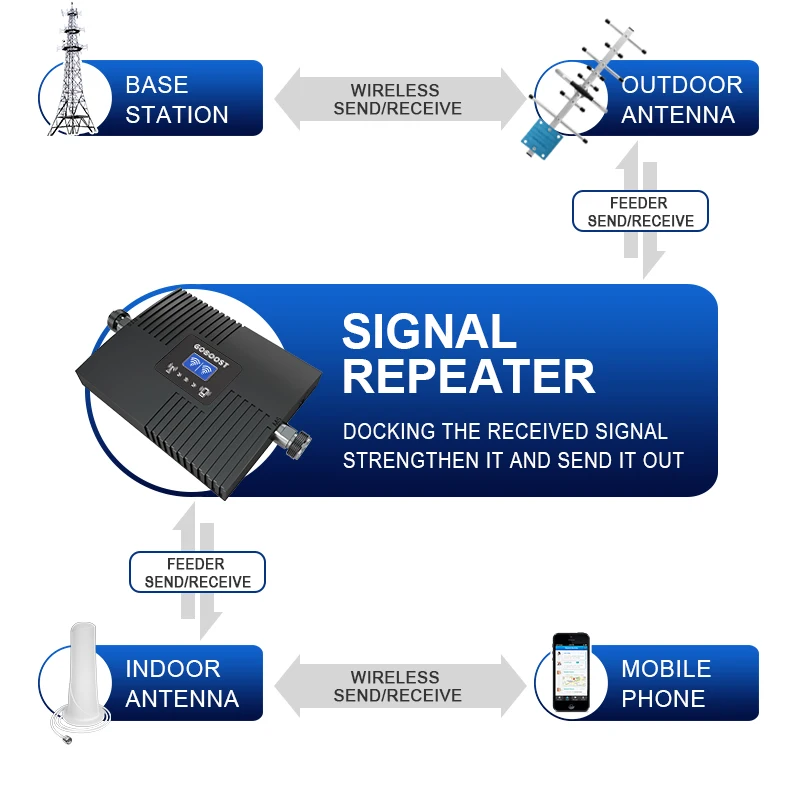 →The signal booster amplify the signal→Indoor antenna transmit the amplified signal