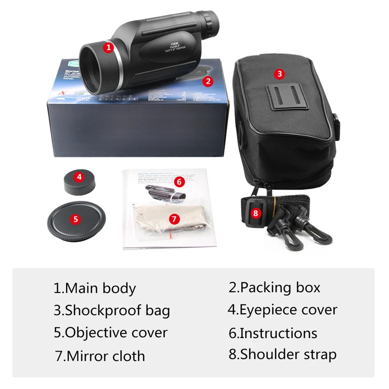 Strap, nylon bag, Instructions for use, lens cap, packing box, eyepiece cleaning cloth