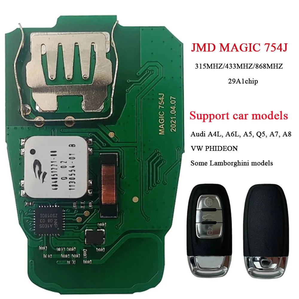 Magic 754J ключ может быть скопирован или запрограммирован повторно для нескольких типов автомобилей без разблокировки. Поддержка использования нескольких устройств программирования на рынке. Magic 754J key разработала все версии частоты 754J на рынке, есть три версии частот 315 МГц, 433 МГц, 868 МГц соответственно. Ключ Magic 754J поддерживает соответствующие модели, такие как Audi A4L, A6L, A5, Q5, A7, A8, VW PHIDEON и т. д. А также поддерживает некоторые модели Lamborghini. В то же время ключ Magic 754J поддерживает повторное копирование, и вам нужно использовать JMD assistant или JMD OBD с функцией assistant для копирования.