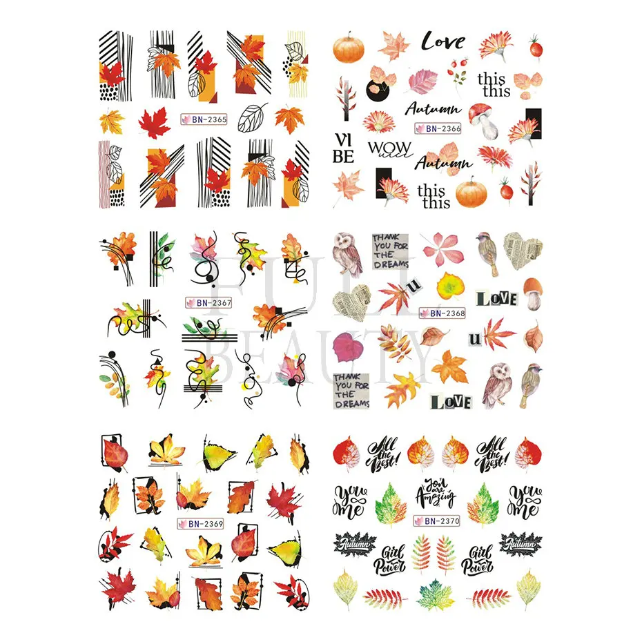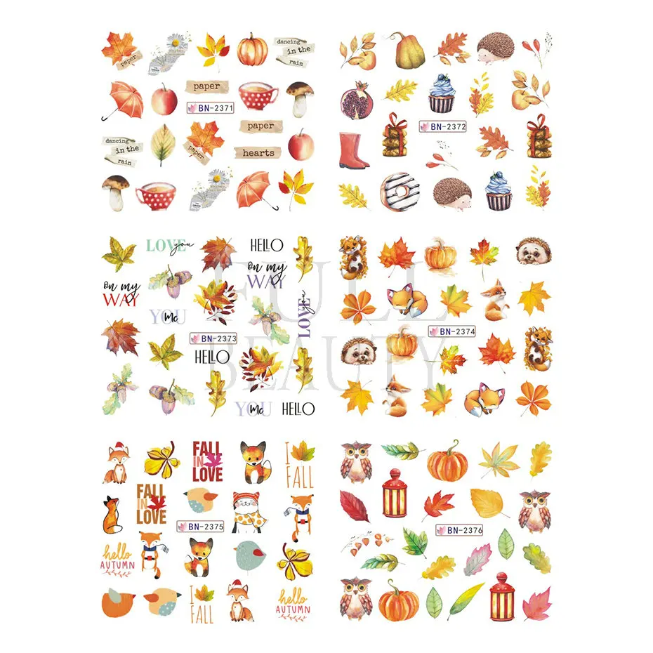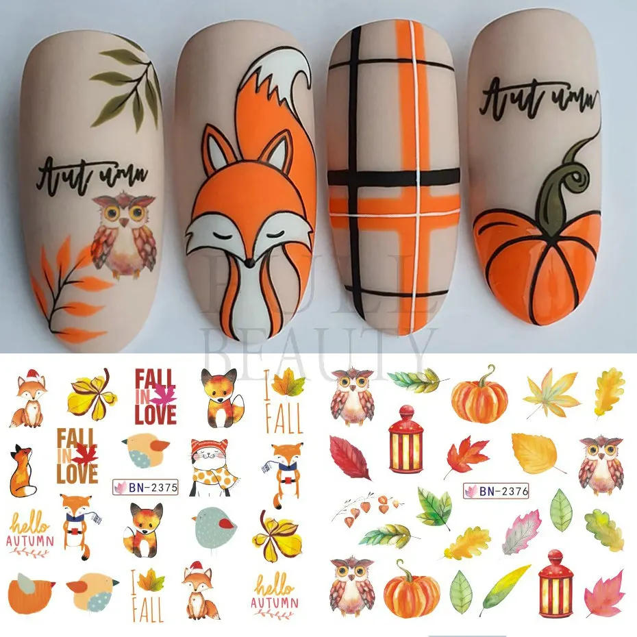 Autumn Fox Maples Nails Stickers Fall Season Leaves Cute Owls Hedgehog Water Decals Nail Charming Sliders Decoration