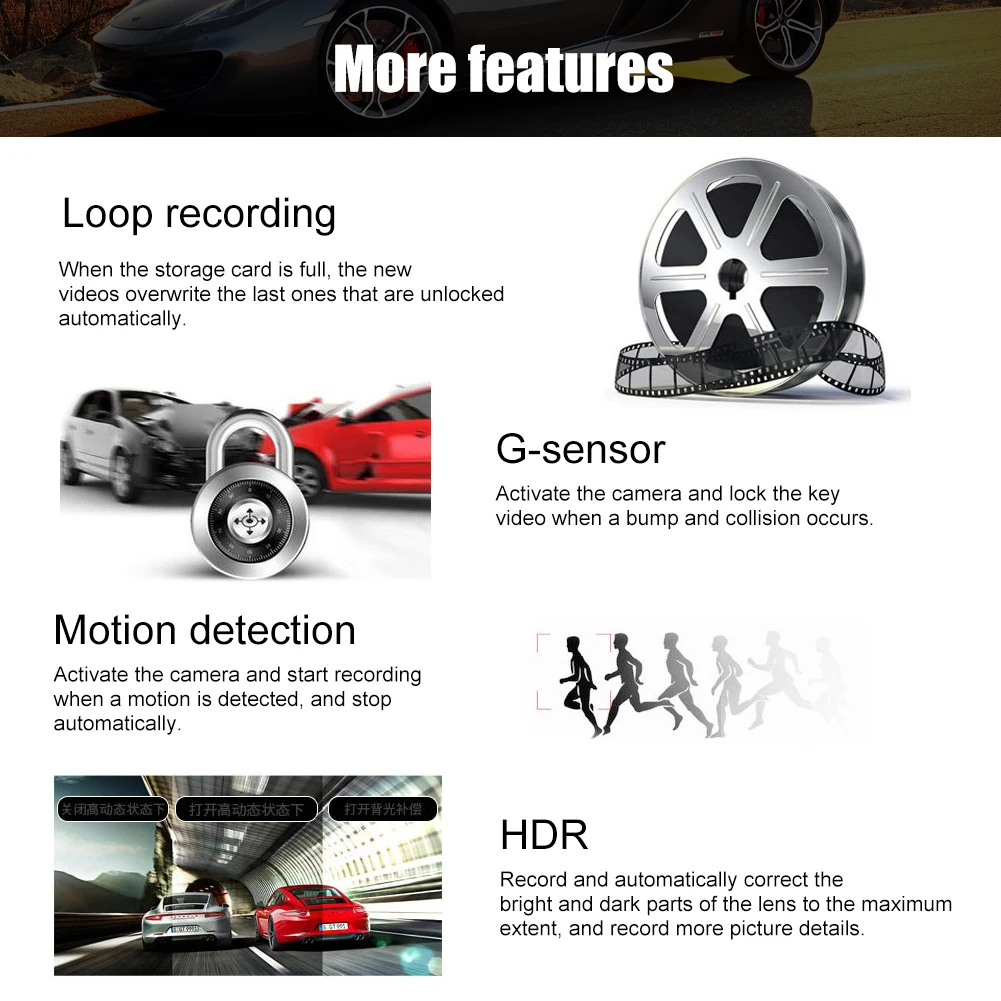* 2. Циклическая запись и g-сенсор: функция циклической записи позволяет камере перезаписывать Последние видео, когда карта памяти заполнена, в то время как g-сенсор активирует чип и блокирует ключевые видео, чтобы избежать перезаписи при столкновении.