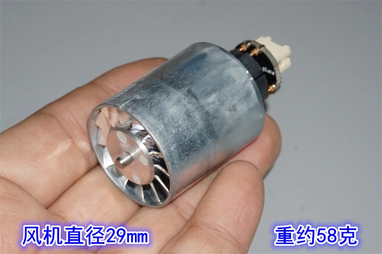 Диаметр вентилятора 29 мм, номинальное напряжение 310V, мощность 110 Вт, скорость более чем 100000 об/мин, и мотор весит около 58 гр.