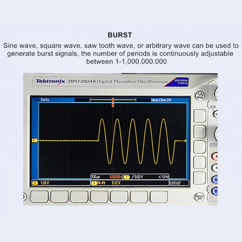 Функция всплеска: Синусоидальная волна, квадратная волна, зубная волна или произвольная волна могут быть использованы для генерирования сигналов всплеска, количество периодов непрерывно регулируется между 1-1000000000.