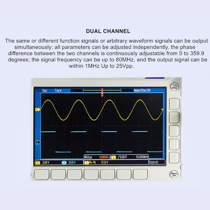 Эквивалентная производительность двухканальный выход: одинаковые или различные функциональные сигналы или сигналы произвольной формы могут быть выходными одновременно; Все параметры могут быть настроены независимо, разница в фазах между двумя каналами постоянно регулируется от 0 до 359,9 градусов; Частота сигнала может быть до 80 МГц, И выходной сигнал может быть в пределах 1 МГц до 25Vpp.