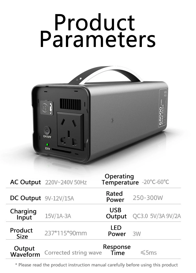 8. Функция аварийного запуска питания: Да 9. Мощный, источник питания для многих видов электронного оборудования, уличное использование, очень удобно использовать на открытом воздухе. Безопасный, эффективный, надежный и долговечный, наружное освещение, несколько режимов ночного освещения, убедитесь, что, бесстрашный ночью, SOS мигающее предупреждение, аварийное освещение, специальные функции, безопасный и эффективный, быстрая зарядка, интеллектуальный контроль температуры, умный чип, множественная защита безопасности, поддержка выхода AC/DC/USB