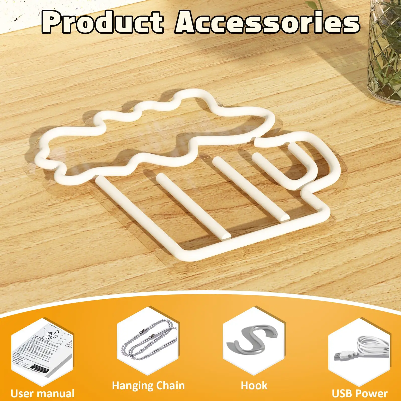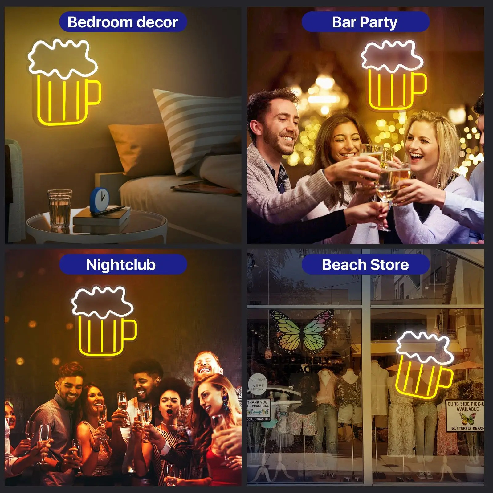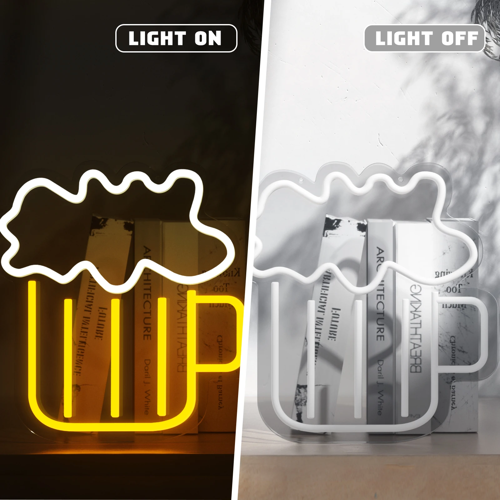 🍺【Unique Beer Shaped Neon Sign Design】Beer neon lights are our independent innovation product.The design is inspired by people’s favorite beer mugs,beer neon light size approx 12.5''x11''inch(32*28cm).Included 2x hanging chain and 1x hook.Keep pressing the button can adjust the brightness(10%-100%).Beer led neon lights with hole could be hung on the wall directly,beer neon sign emits a warm yellow and white glow,it gives a very warm and pleasant feeling.