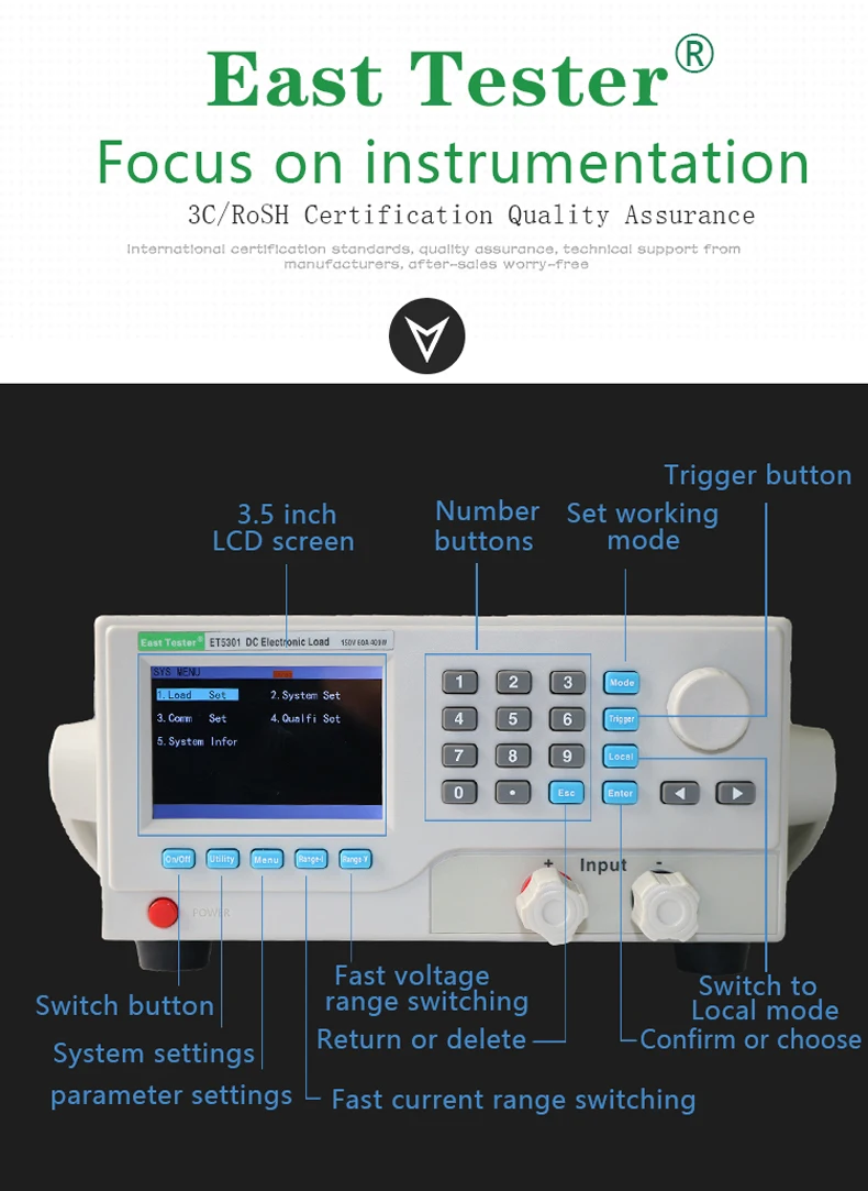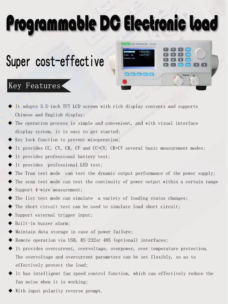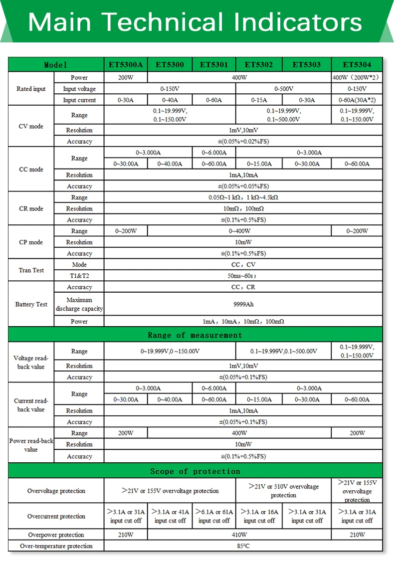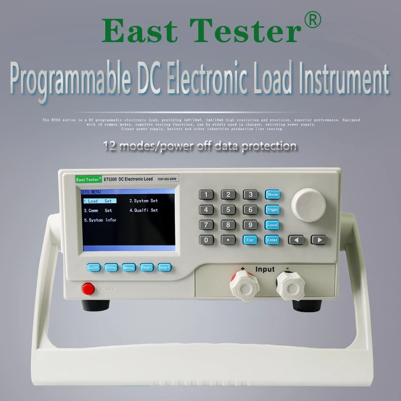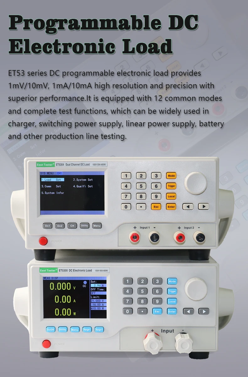 ET53Серия DC программируемая электронная нагрузка обеспечивает 1МВ/10мв, 1мА/10мА высокое разрешение и точность с превосходной производительностью. Он оснащен 12 распространенными режимами и полными испытательными функциями, которые могут широко использоваться в зарядном устройстве, импульсном блоке питания, линейном блоке питания, батарее и других испытаниях производственной линии.