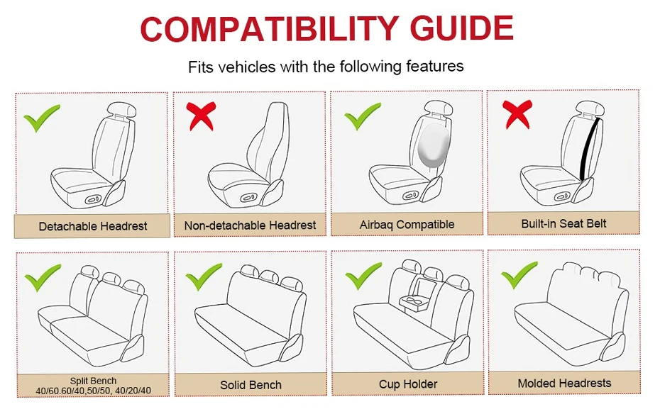 4. MAINTAIN FUNCTIONALITY: Seat covers are engineered around the car, keeping the seat's full function and control, such as airbag, seatbelts, armrests and seat adjustments. Separate headrest covers allow easy headrest adjustment for optimal comfort and safety.
