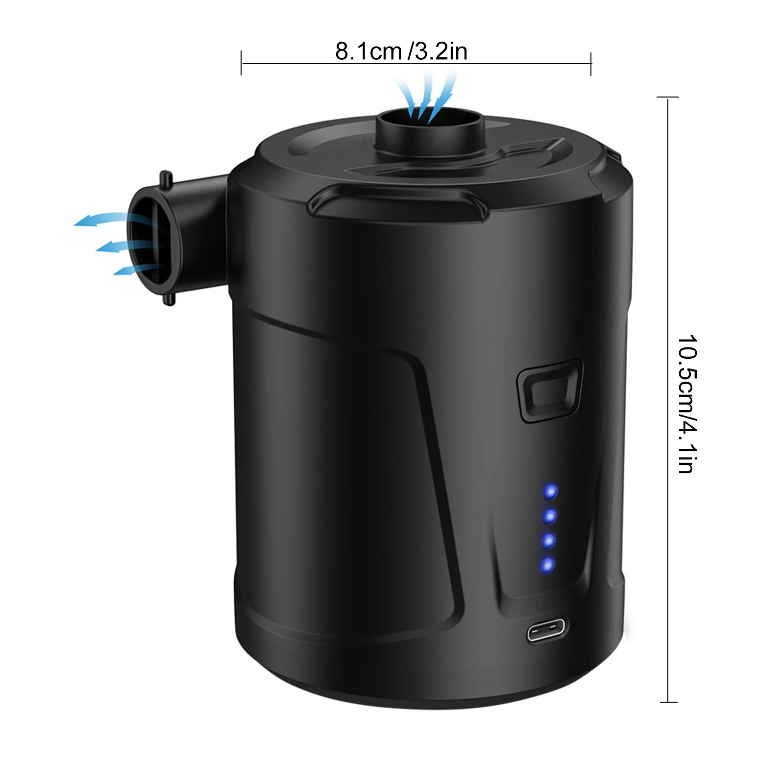 1. Перезаряжаемый Электрический насос USB: насос с интерфейсом USB Type-C, подключите розетку питания, компьютер, автомобильное зарядное устройство USB или мобильный источник питания для зарядки электрического насоса. Поскольку воздушный насос работает от аккумулятора, он работает без проводов и не требует накачивания предметов, прежде чем взять его на улицу.