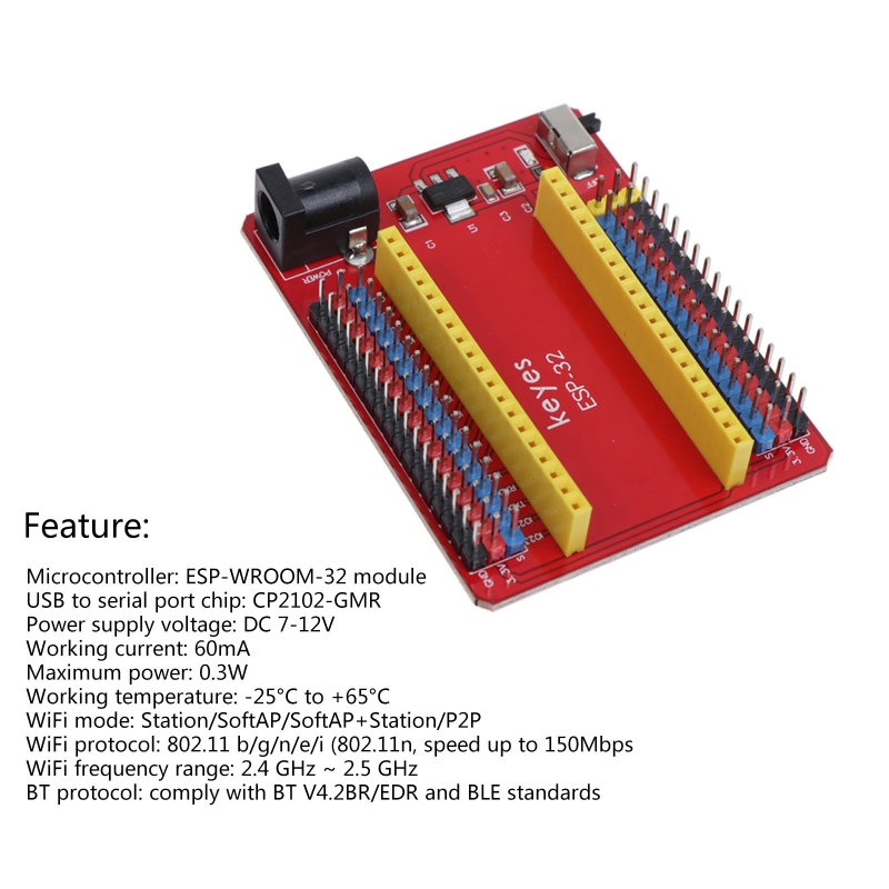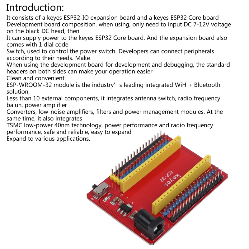 Он может поставить питание к основной плате keyes ESP32. И плата расширения также поставляется с 1 циферблатом codeSwitch, используемым для управления переключателем питания. Разработчики могут подключать периферийные устройства в соответствии с их потребностями.<br/>