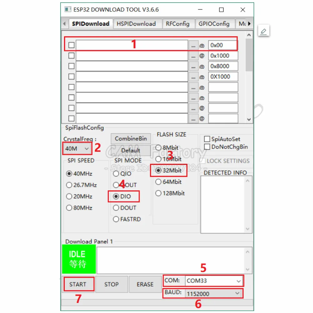 Как показано на рис. 7-1 ниже: Выберите Путь прошивки, который будет гореть при 1. Адрес обычно 0X00. После установки не забудьте поставить отметку спереди; Выберите системные часы на частоте 40 МГц в 2 местах; Выберите размер вспышки как 32 Мбит в 3 местах; выберите режим SPI как режим DIO в 4 местах; Выберите номер порта текущей платы, распознаваемый компьютером в 5; Выберите скорость передачи данных последовательного порта в 6 местах (чем больше значение, тем быстрее скорость загрузки прошивки и максимальная поддержка составляет 1152000bps); После завершения предыдущей конфигурации, нажмите на кнопку 7, чтобы начать запись прошивки.