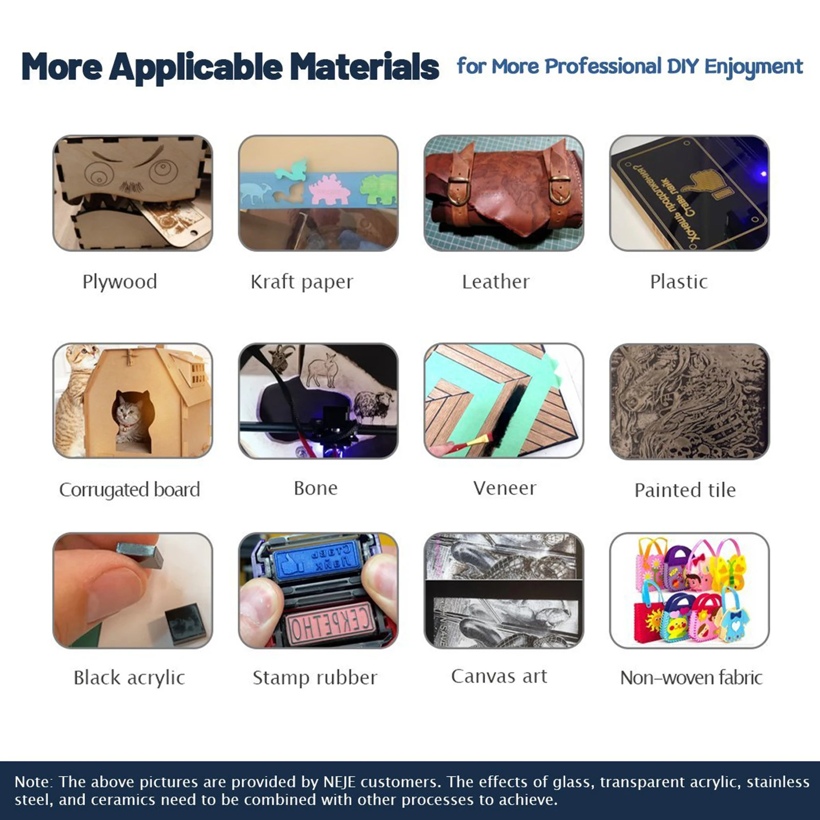 2. Расширенный лазерный модуль: Многофункциональный модуль NEJE, может получить высокую мощность и быструю производительность сканирования. Встроенный Быстрый Интеллектуальный привод, отзывы о температурах могут быть своевременными, разумно Отрегулируйте вентилятор, чтобы уменьшить шум, безопасный и тихий в использовании.